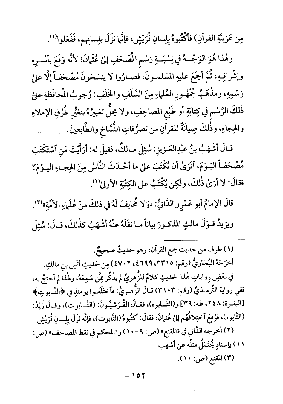 قال أشهب بن عبد العزيز: سئل مالك، فقيل له: أرأيت من استكتب مصحفا اليوم، أترى أن يكتب على ما أحدث النّاس من الهجاء اليوم؟ فقال: لا أرى ذلك، ولكن يكتب على الكتبة الأولى (¬2).