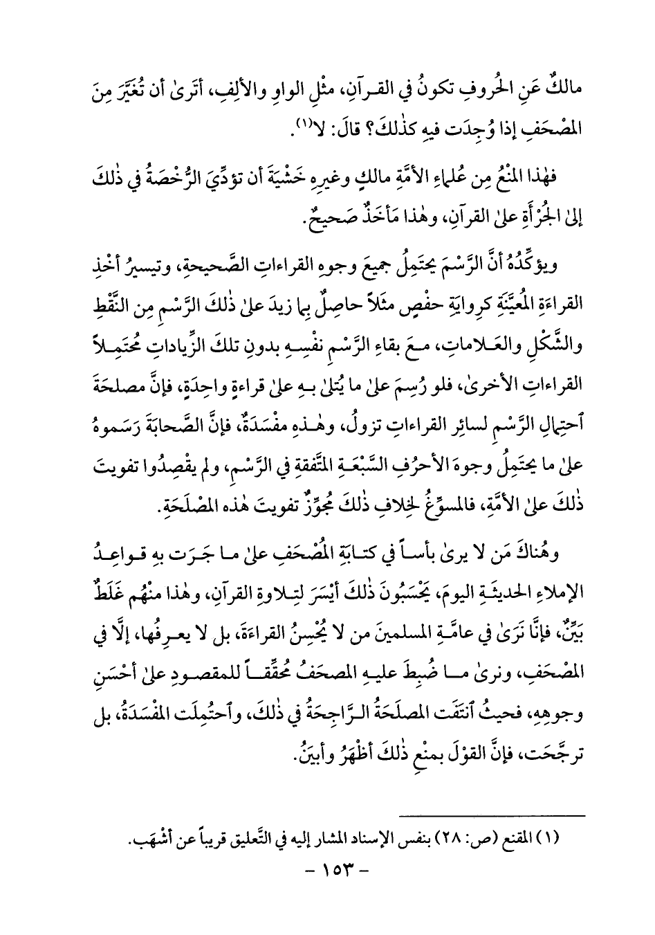 وهناك من لا يرى بأسا في كتابة المصحف على ما جرت به قواعد الإملاء الحديثة اليوم، يحسبون ذلك أيسر لتلاوة القرآن، وهذا منهم غلط بيّن، فإنّا نرى في عامّة المسلمين من لا يحسن القراءة، بل لا يعرفها، إلّا في المصحف، ونرى ما ضبط عليه المصحف محقّقا للمقصود على أحسن وجوهه، فحيث انتفت المصلحة الرّاجحة في ذلك، واحتملت المفسدة، بل ترجّحت، فإنّ القول بمنع ذلك أظهر وأبين.