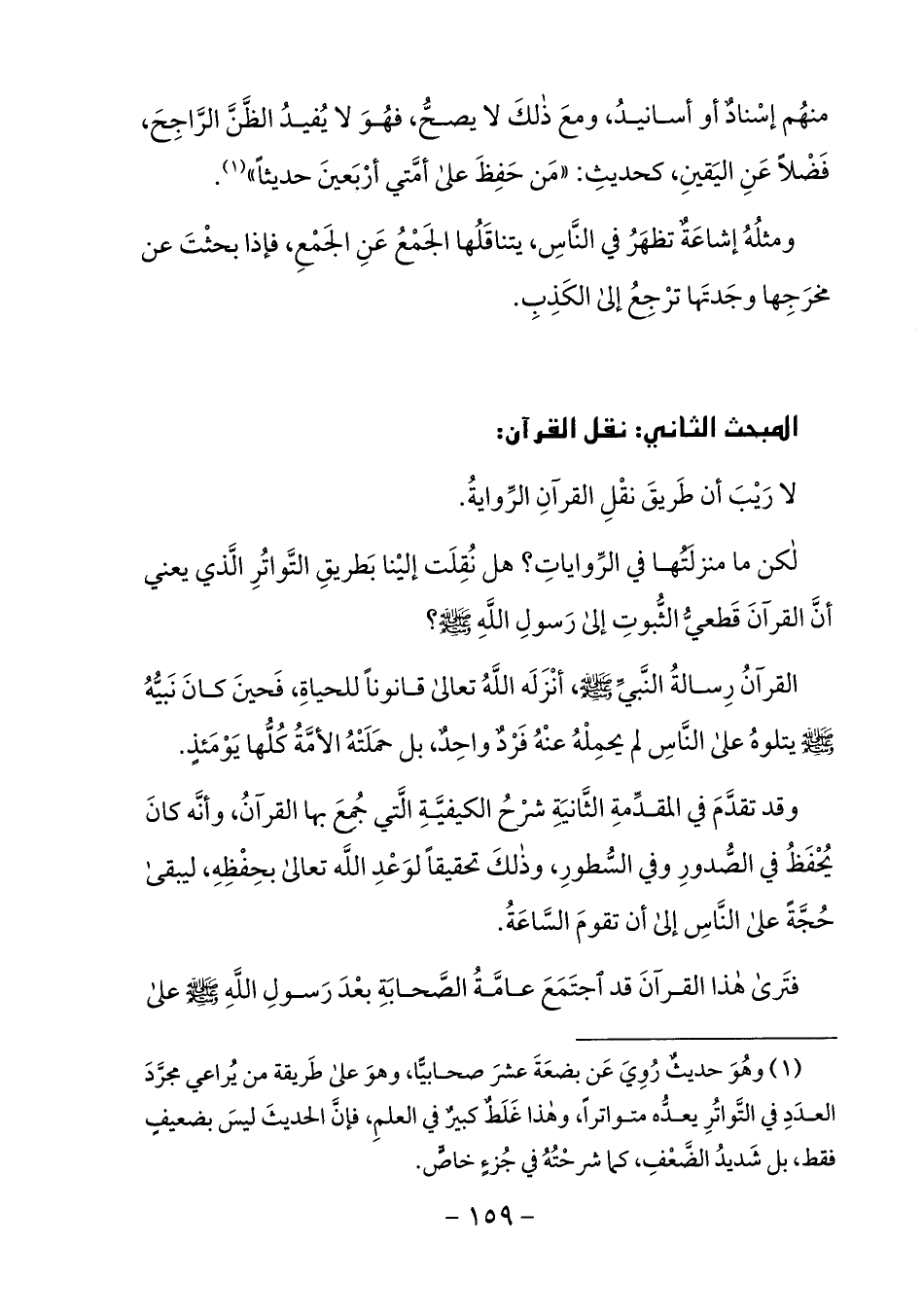 (¬1) وهو حديث روي عن بضعة عشر صحابيّا، وهو على طريقة من يراعي مجرّد العدد في التّواتر يعدّه متواترا، وهذا غلط كبير في العلم، فإنّ الحديث ليس بضعيف فقط، بل شديد الضّعف، كما شرحته في جزء خاصّ.