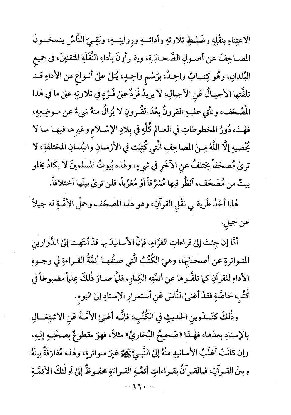 الاعتناء بنقله وضبط تلاوته وأدائه وروايته، وبقي النّاس ينسخون المصاحف عن أصول الصّحابة، ويقرءون بأداء النّقلة المتقنين، في جميع البلدان، وهو كتاب واحد، برسم واحد، يتلى على أنواع من الأداء قد تلقّتها الأجيال عن الأجيال، لا يزيد فرد على فرد في تلاوته على ما في هذا المصحف، وتأتي عليه القرون بعد القرون لا يزال منه شيء عن موضعه، فهذه دور المخطوطات في العالم كلّه في بلاد الإسلام وغيرها فيها ما لا يحصيه إلّا الله من المصاحف الّتي كتبت في الأزمان والبلدان المختلفة، لا ترى مصحفا يختلف عن الآخر في شيء، وهذه بيوت المسلمين لا يكاد يخلو بيت من مصحف، انظر فيها مشرّقا أو مغرّبا، فلن ترى بينها اختلافا.