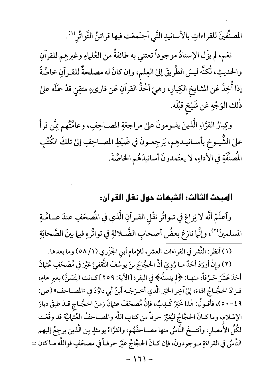 واعلم أنّه لا نزاع في تواتر نقل القرآن الّذي في المصحف عند عامّة المسلمين (¬2)، وإنّما نازع بعض أصحاب الضّلالة في تواتره فيما