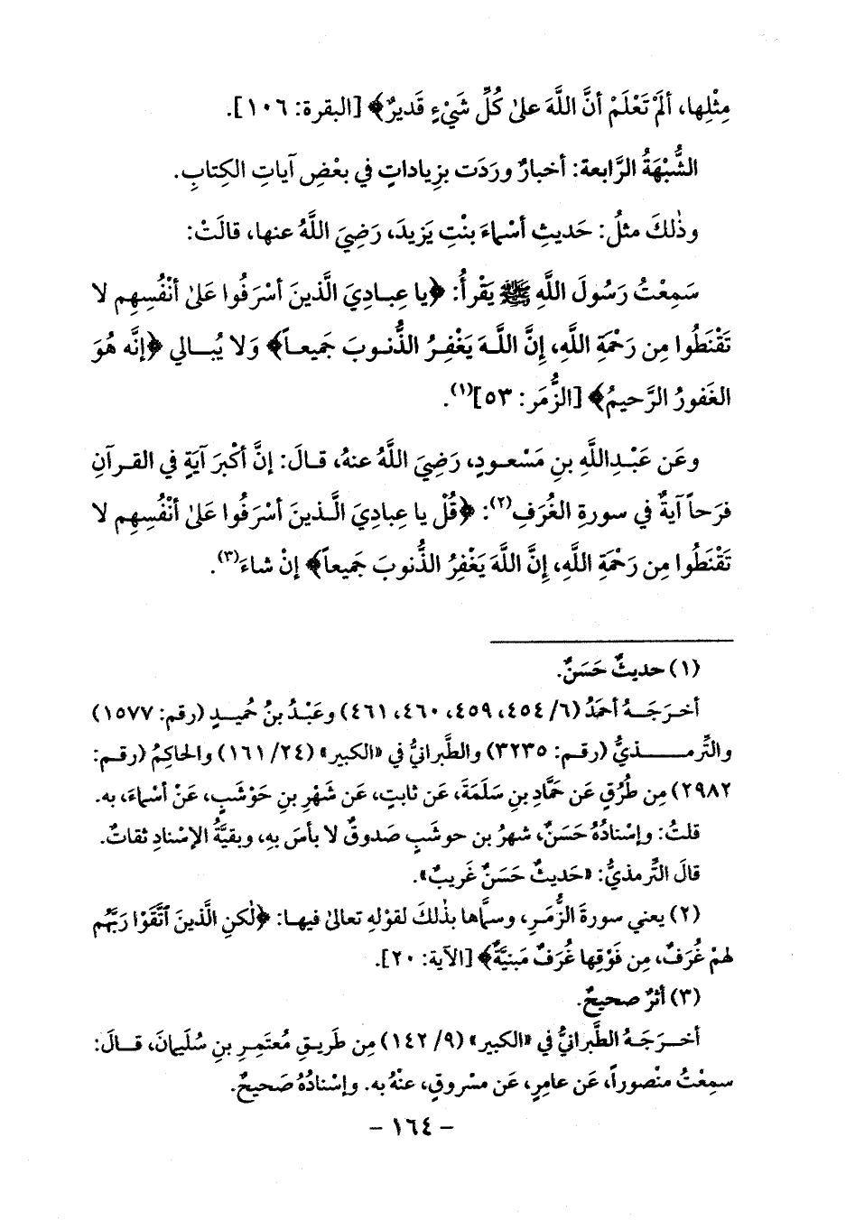 وعن عبد الله بن مسعود، رضي الله عنه، قال: إنّ أكبر آية في القرآن فرجا آية في سورة الغرف (¬2): قُلْ يا عِبادِيَ الَّذِينَ أَسْرَفُوا عَلى أَنْفُسِهِمْ لا تَقْنَطُوا مِنْ رَحْمَةِ اللَّهِ إِنَّ