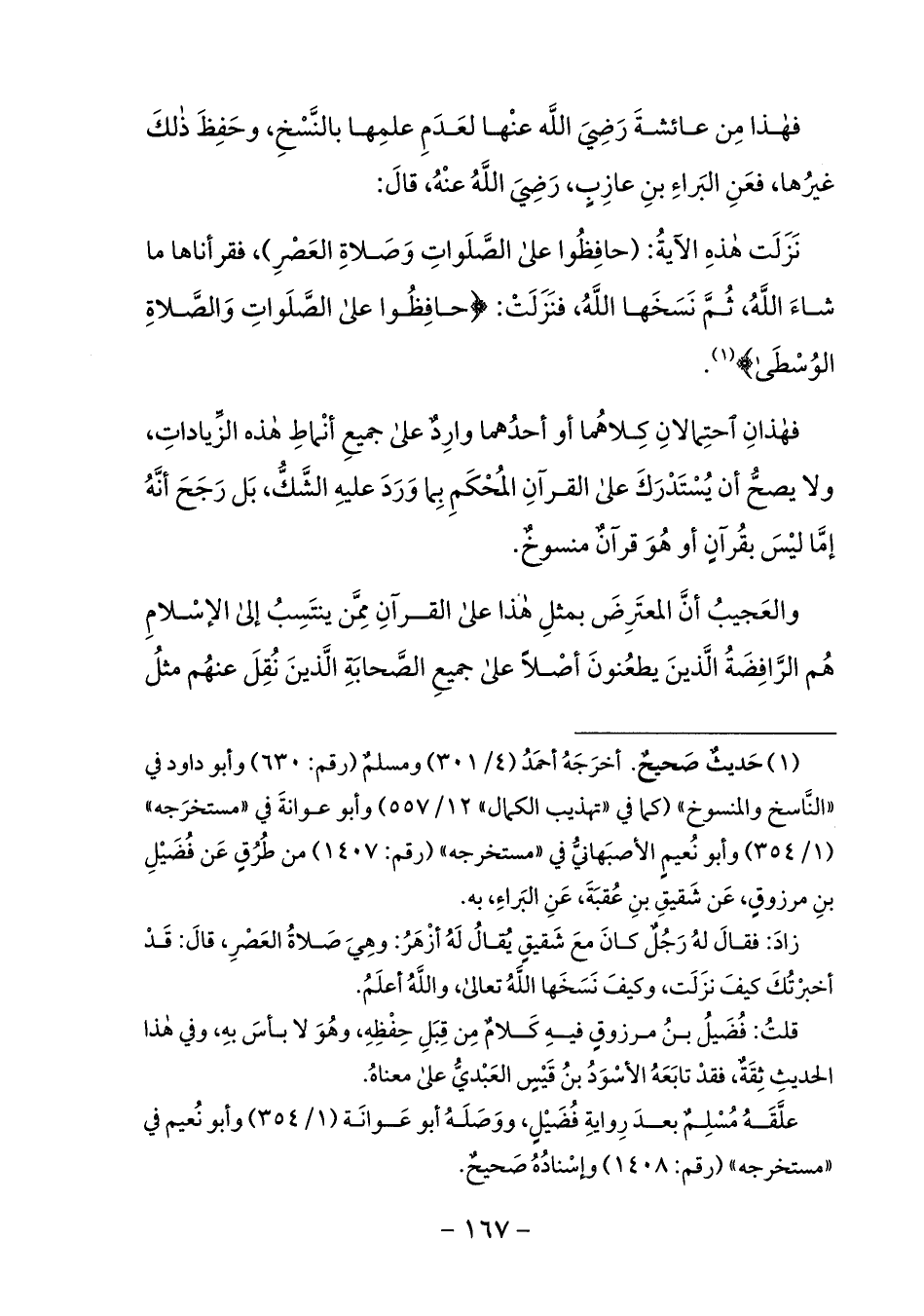 نزلت هذه الآية: (حافظوا على الصّلوات وصلاة العصر)، فقرأناها ما شاء الله، ثمّ نسخها الله، فنزلت: حافِظُوا عَلَى الصَّلَواتِ وَالصَّلاةِ الْوُسْطى (¬1).