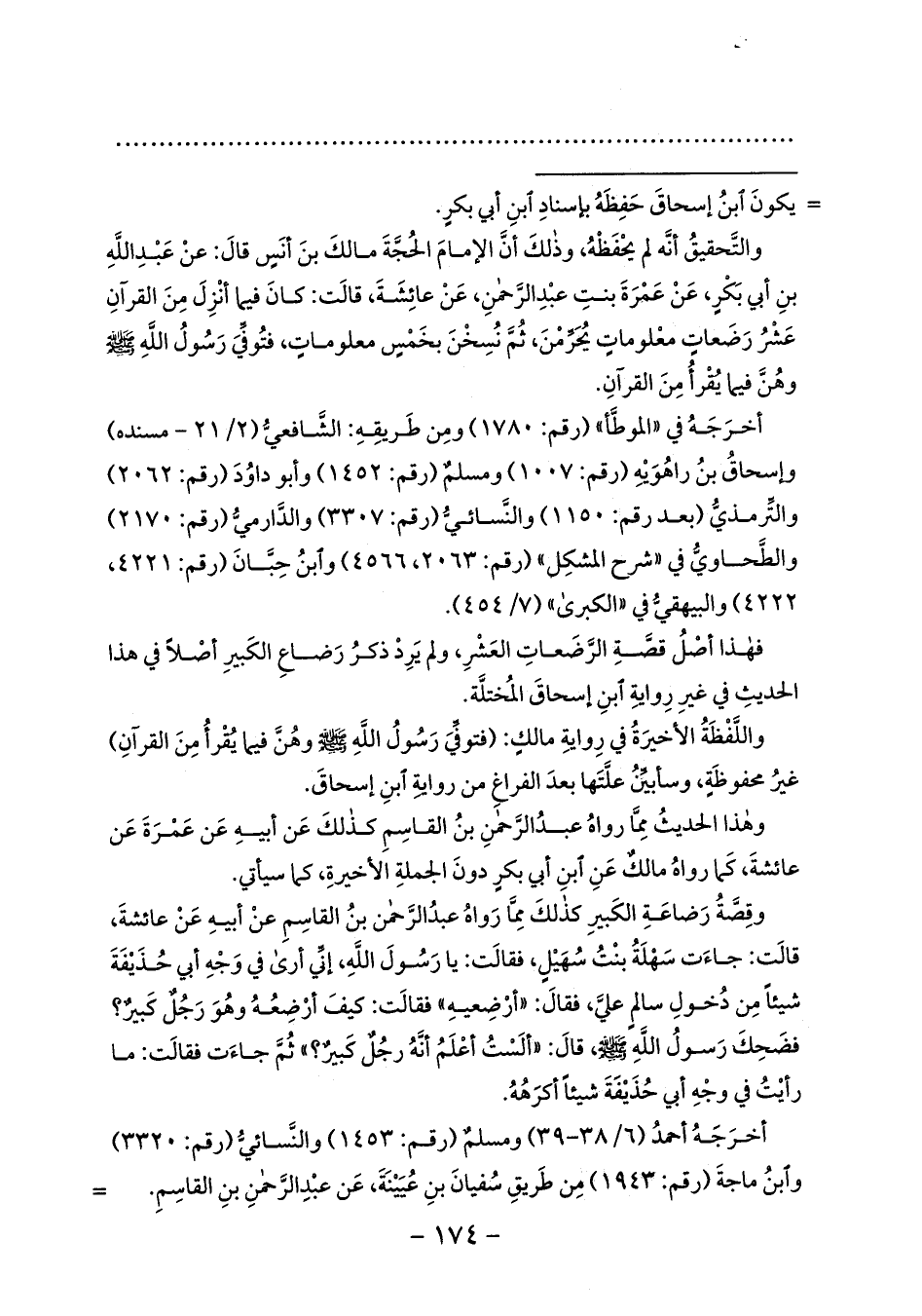 والتّحقيق أنّه لم يحفظه، وذلك أنّ الإمام الحجّة مالك بن أنس قال: عن عبد الله بن أبي بكر، عن عمرة بنت عبد الرّحمن، عن عائشة، قالت: كان فيما أنزل من القرآن عشر رضعات معلومات يحرّمن، ثمّ