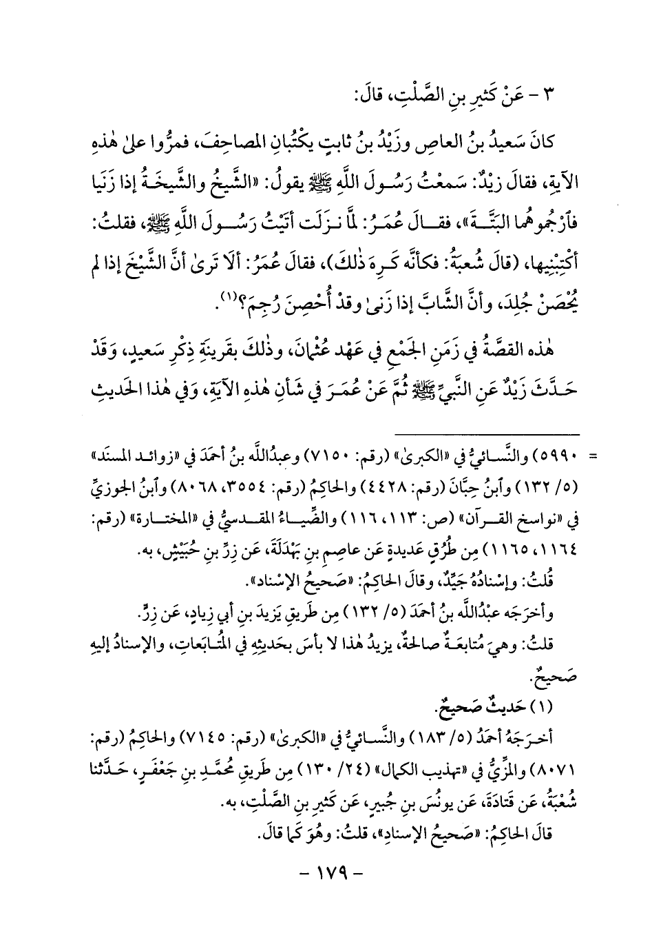 كان سعيد بن العاص وزيد بن ثابت يكتبان المصاحف، فمرّوا على هذه الآية، فقال زيد: سمعت رسول الله صلى الله عليه وسلم يقول: «الشّيخ والشّيخة إذا زنيا فارجموهما البتّة»، فقال عمر: لمّا نزلت أتيت رسول الله صلى الله عليه وسلم، فقلت: أكتبنيها، (قال شعبة: فكأنّه كره ذلك)، فقال عمر: ألا ترى أنّ الشّيخ إذا لم يحصن جلد، وأنّ الشّابّ إذا زنى وقد أحصن رجم؟ (¬1).