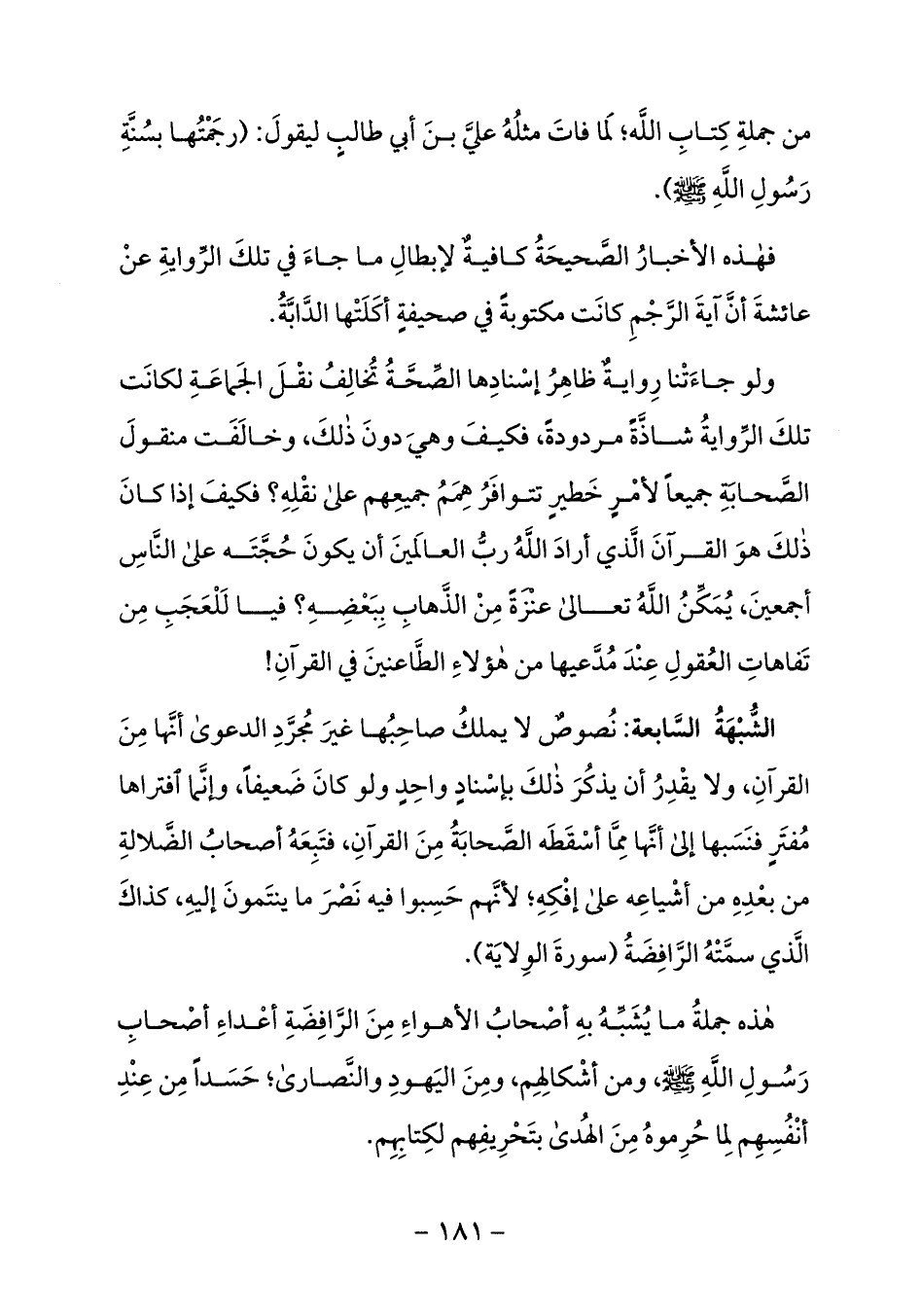 الشّبهة السّابعة: نصوص لا يملك صاحبها غير مجرّد الدعوى أنّها من القرآن، ولا يقدر أن يذكر ذلك بإسناد واحد ولو كان ضعيفا، وإنّما افتراها مفتر فنسبها إلى أنّها ممّا أسقطه الصّحابة من القرآن، فتبعه أصحاب الضّلالة من بعده من أشياعه على إفكه؛ لأنّهم حسبوا فيه نصر ما ينتمون إليه، كذاك الّذي سمّته الرّافضة (سورة الولاية).