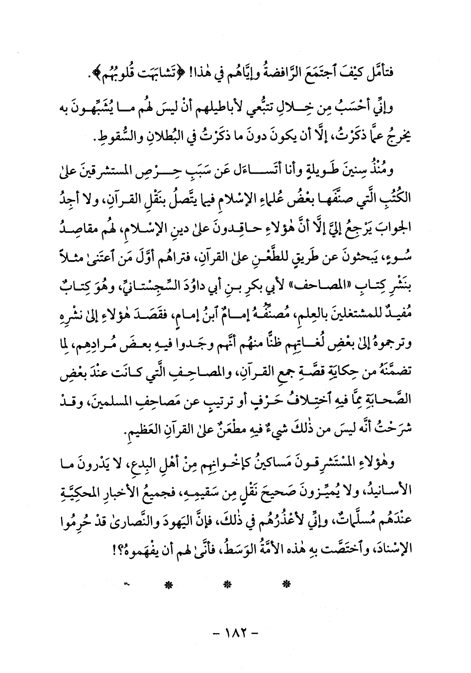ومنذ سنين طويلة وأنا أتساءل عن سبب حرص المستشرقين على الكتب الّتي صنّفها بعض علماء الإسلام فيما يتّصل بنقل القرآن، ولا أجد الجواب يرجع إليّ إلّا أنّ هؤلاء حاقدون على دين الإسلام، لهم مقاصد سوء، يبحثون عن طريق للطّعن على القرآن، فتراهم أوّل من اعتنى مثلا بنشر كتاب «المصاحف» لأبي بكر بن أبي داود السّجستانيّ، وهو كتاب مفيد للمشتغلين بالعلم، مصنّفه إمام ابن إمام، فقصد هؤلاء إلى نشره وترجموه إلى بعض لغاتهم ظنّا منهم أنّهم وجدوا فيه بعض مرادهم، لما تضمّنه من حكاية قصّة جمع القرآن، والمصاحف الّتي كانت عند بعض الصّحابة ممّا فيه اختلاف حرف أو ترتيب عن
