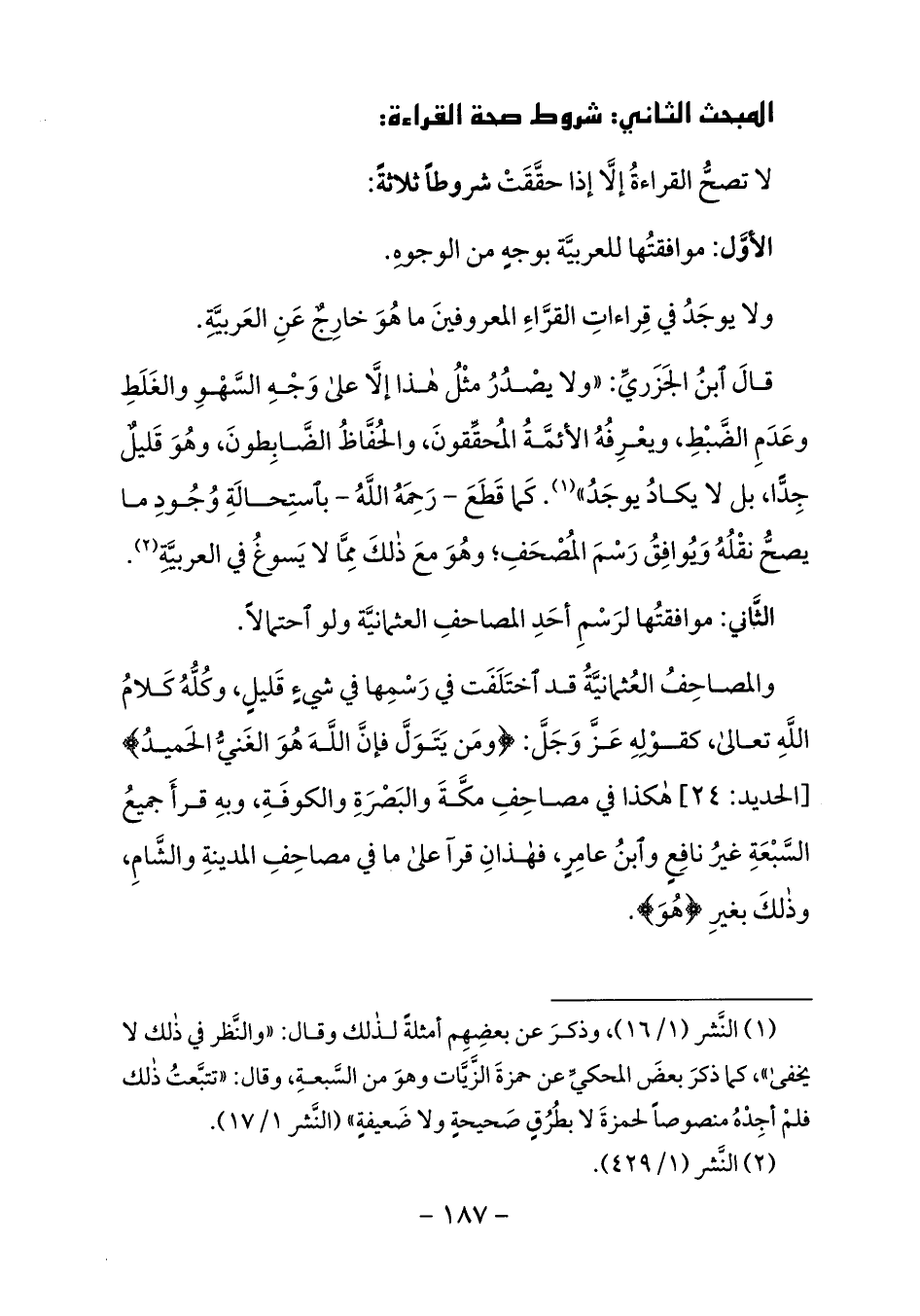 (¬1) النّشر (1/ 16)، وذكر عن بعضهم أمثلة لذلك وقال: «والنّظر في ذلك لا يخفى»، كما ذكر بعض المحكيّ عن حمزة الزّيّات وهو من السّبعة، وقال: «تتّبعت ذلك فلم أجده منصوصا لحمزة لا بطرق صحيحة ولا ضعيفة» (النّشر 1/ 17).