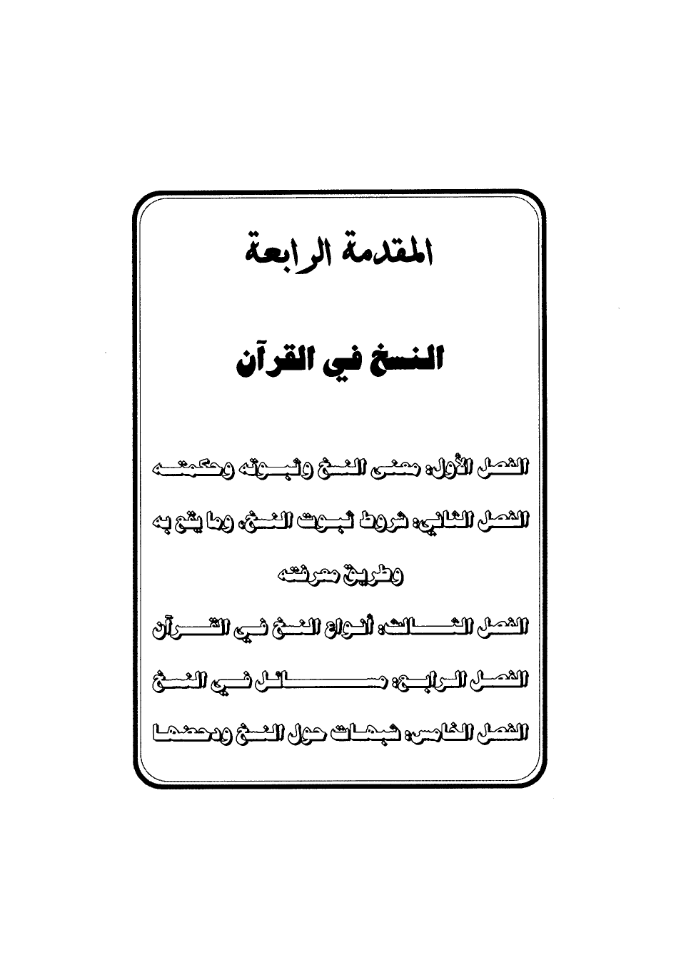 الفصل الأول: معنى النسخ وثبوته وحكمته الفصل الثاني: شروط ثبوت النسخ، وما يقع به، وطريق معرفته الفصل الثالث: أنواع النسخ في القرآن الفصل الرابع: مسائل في النسخ الفصل الخامس: شبهات حول النسخ ودحضها
