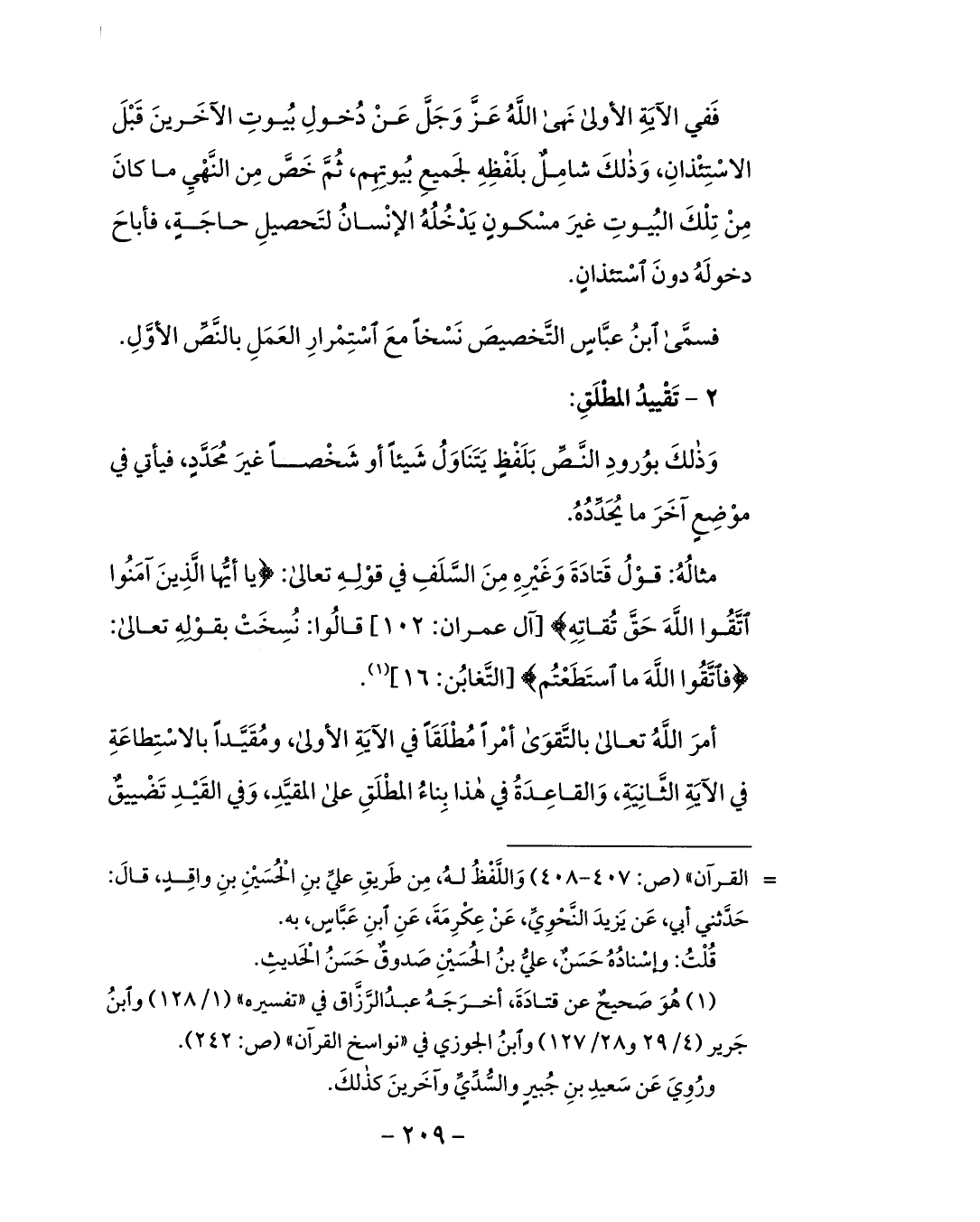 فسمّى ابن عبّاس التّخصيص نسخا مع استمرار العمل بالنّصّ الأوّل.