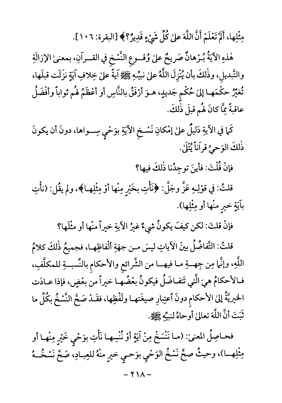 قلت: التّفاضل بين الآيات ليس من جهة ألفاظها، فجميع ذلك كلام الله، وإنّما من جهة ما فيها من الشّرائع والأحكام بالنّسبة للمكلّف، فالأحكام هي الّتي تتفاضل فيكون بعضها خيرا من بعض، فإذا عادت الخيريّة إلى الأحكام دون اعتبار صيغتها ولفظها، فقد صحّ النّسخ بكلّ ما ثبت أنّ الله تعالى أوحاه لنبيّه صلى الله عليه وسلم.