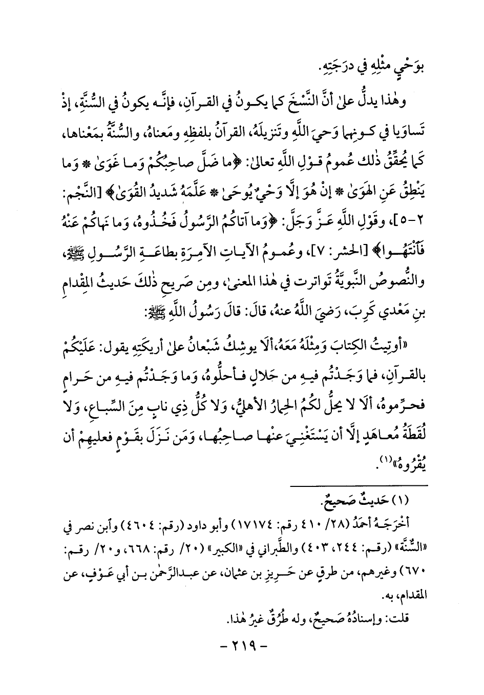 السّنّة، إذ تساويا في كونهما وحي الله وتنزيله، القرآن بلفظه ومعناه، والسّنّة بمعناها، كما يحقّق ذلك عموم قول الله تعالى: ما ضَلَّ صاحِبُكُمْ وَما غَوى 2 وَما يَنْطِقُ عَنِ الْهَوى 3 إِنْ هُوَ إِلَّا وَحْيٌ يُوحى 4 عَلَّمَهُ شَدِيدُ الْقُوى 5 [النّجم: 2 - 5]، وقول الله عزّ وجلّ: وَما آتاكُمُ الرَّسُولُ فَخُذُوهُ وَما نَهاكُمْ عَنْهُ فَانْتَهُوا [الحشر: 7]، وعموم الآيات الآمرة بطاعة الرّسول صلى الله عليه وسلم، والنّصوص النّبويّة تواترت في هذا المعنى، ومن صريح ذلك حديث المقدام بن معدي كرب، رضي الله عنه، قال: قال رسول الله صلى الله عليه وسلم: