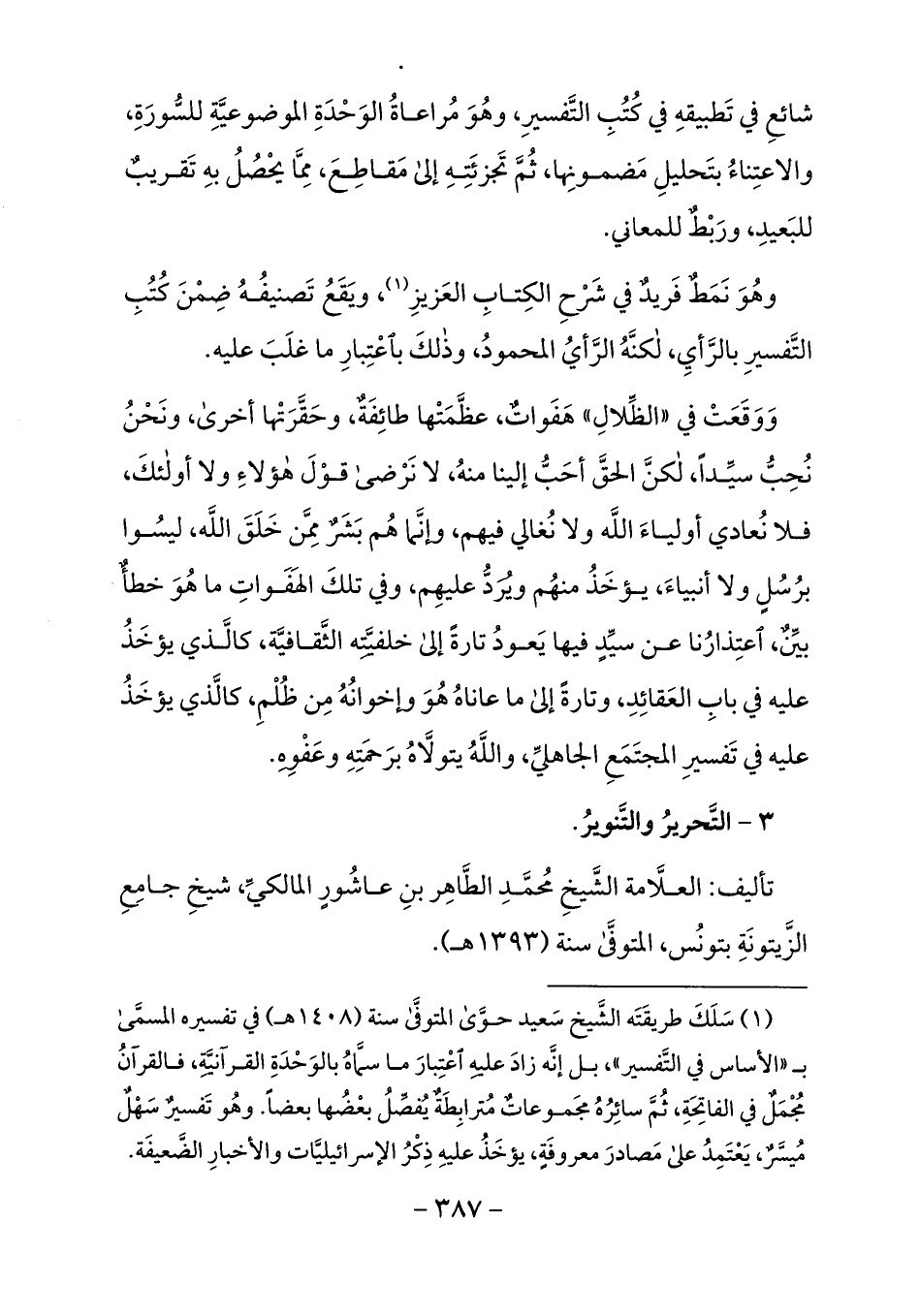 (¬1) سلك طريقته الشّيخ سعيد حوّى المتوفّى سنة (1408 هـ) في تفسيره المسمّى ب «الأساس في التّفسير»، بل إنّه زاد عليه اعتبار ما سمّاه بالوحدة القرآنيّة، فالقرآن مجمل في الفاتحة، ثمّ سائره مجموعات مترابطة يفصّل بعضها بعضا. وهو تفسير سهل ميسّر، يعتمد على مصادر معروفة، يؤخذ عليه ذكر الإسرائيليّات والأخبار الضّعيفة.