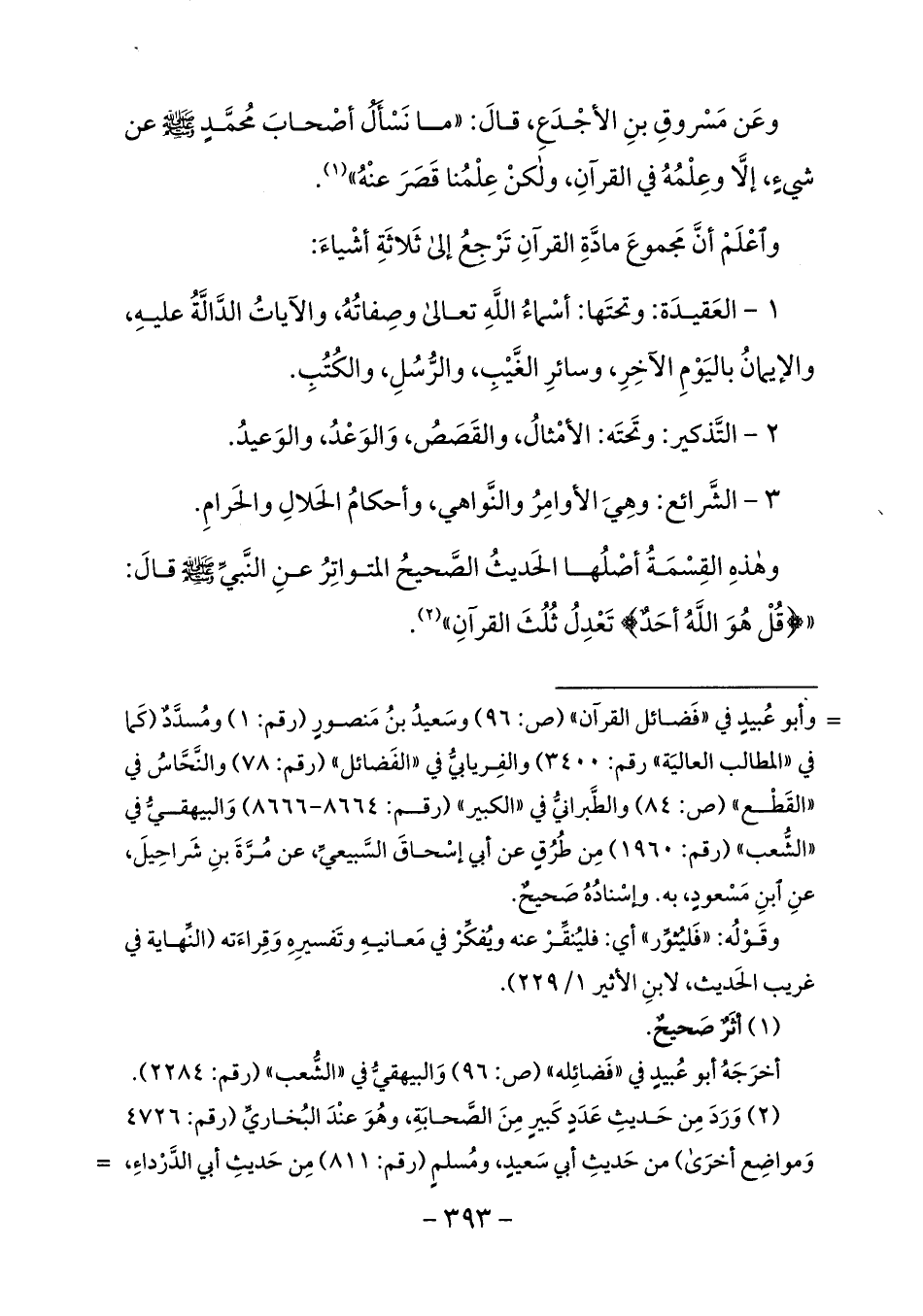 وهذه القسمة أصلها الحديث الصّحيح المتواتر عن النّبيّ صلى الله عليه وسلم قال: «قُلْ هُوَ اللَّهُ أَحَدٌ 1 تعدل ثلث القرآن» (¬2).