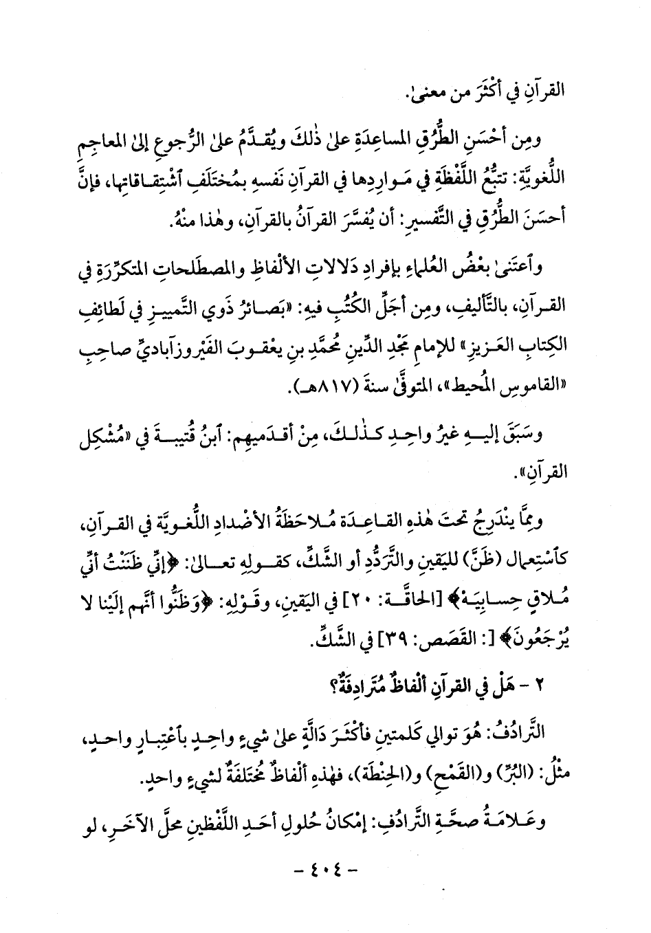 وممّا يندرج تحت هذه القاعدة ملاحظة الأضداد اللّغويّة في القرآن، كاستعمال (ظنّ) لليقين والتّردّد أو الشّكّ، كقوله تعالى: إِنِّي ظَنَنْتُ أَنِّي مُلاقٍ حِسابِيَهْ 20 [الحاقّة: 20] في اليقين، وقوله: وَظَنُّوا أَنَّهُمْ إِلَيْنا لا يُرْجَعُونَ [القصص: 39] في الشّكّ.