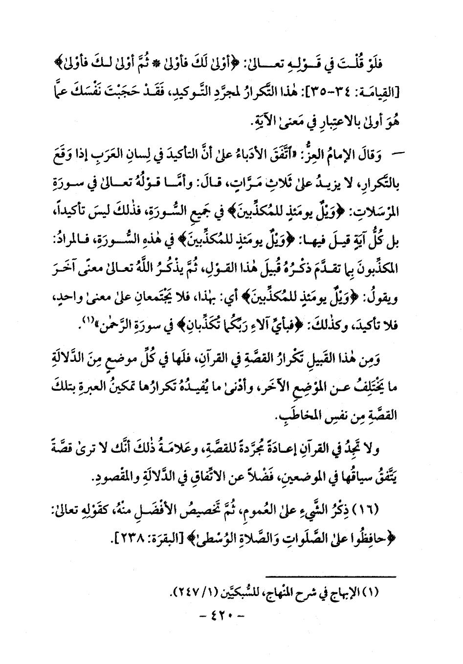 وقال الإمام العزّ: «اتّفق الأدباء على أنّ التأكيد في لسان العرب إذا وقع بالتّكرار، لا يزيد على ثلاث مرّات، قال: وأمّا قوله تعالى في سورة المرسلات: فَوَيْلٌ يَوْمَئِذٍ لِلْمُكَذِّبِينَ 15 في جميع السّورة، فذلك ليس تأكيدا، بل كلّ آية قيل فيها: فَوَيْلٌ يَوْمَئِذٍ لِلْمُكَذِّبِينَ 15 في هذه السّورة، فالمراد: المكذّبون بما تقدّم ذكره قبيل هذا القول، ثمّ يذكر الله تعالى معنى آخر ويقول: فَوَيْلٌ يَوْمَئِذٍ لِلْمُكَذِّبِينَ 15 أي: بهذا، فلا يجتمعان على معنى واحد، فلا تأكيد، وكذلك: فَبِأَيِّ آلاءِ رَبِّكُما تُكَذِّبانِ 13* في سورة الرّحمن» (¬1).