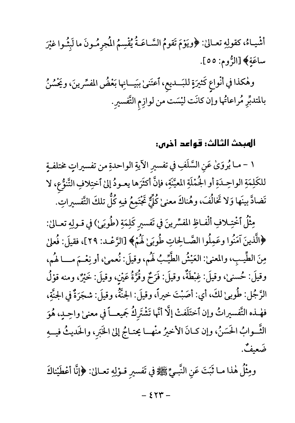 1 - ما يروى عن السّلف في تفسير الآية الواحدة من تفسيرات مختلفة للكلمة الواحدة أو الجملة المعيّنة، فإنّ أكثرها يعود إلى اختلاف التّنوّع، لا تضادّ بينها ولا تخالف، وهناك معنى كلّيّ تجتمع فيه كلّ تلك التّفسيرات.