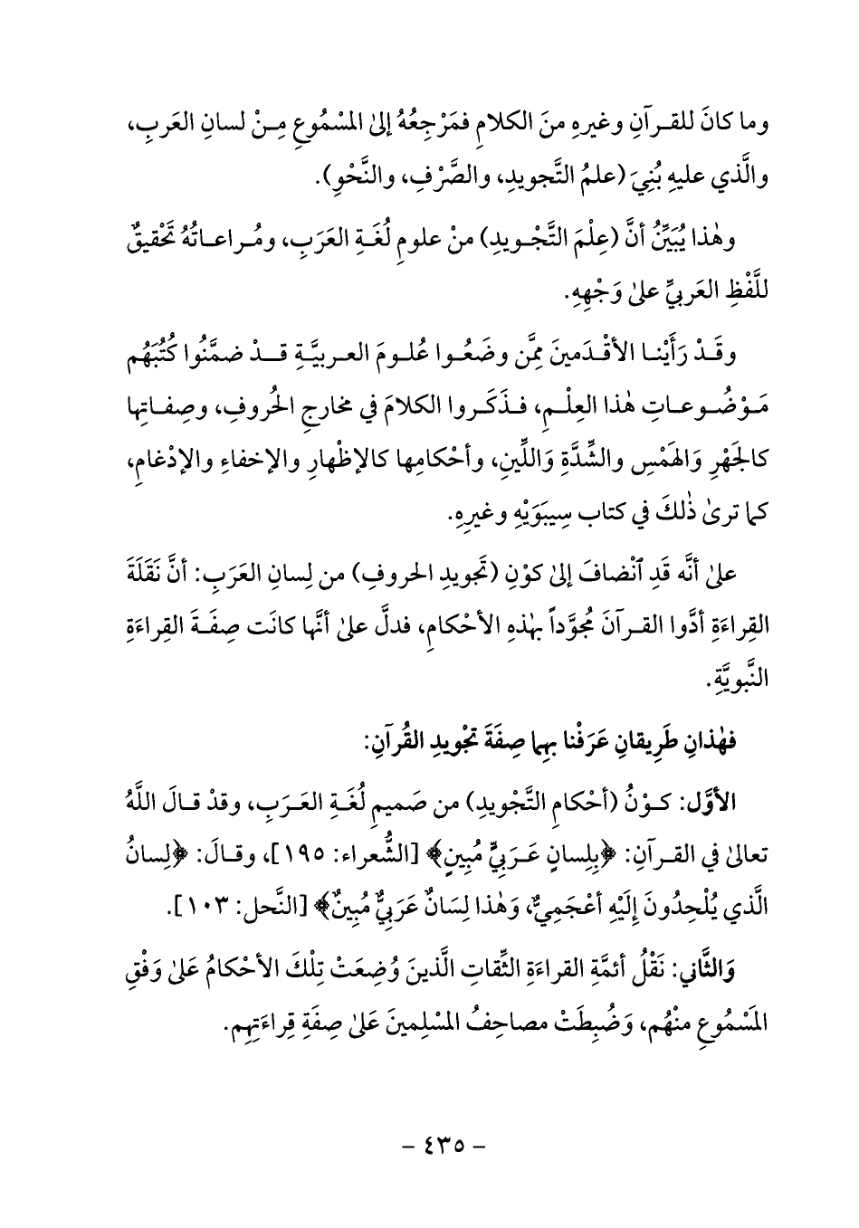 الأوّل: كون (أحكام التّجويد) من صميم لغة العرب، وقد قال الله تعالى في القرآن: بِلِسانٍ عَرَبِيٍّ مُبِينٍ 195 [الشّعراء: 195]، وقال: