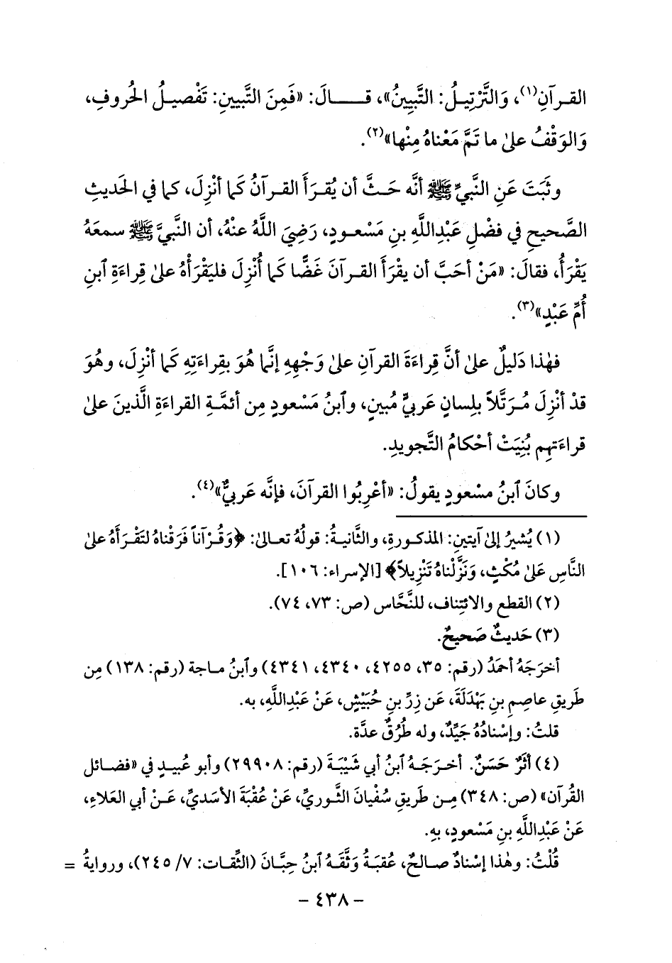 فهذا دليل على أنّ قراءة القرآن على وجهه إنّما هو بقراءته كما أنزل، وهو قد أنزل مرتّلا بلسان عربيّ مبين، وابن مسعود من أئمّة القراءة الّذين على قراءتهم بنيت أحكام التّجويد.