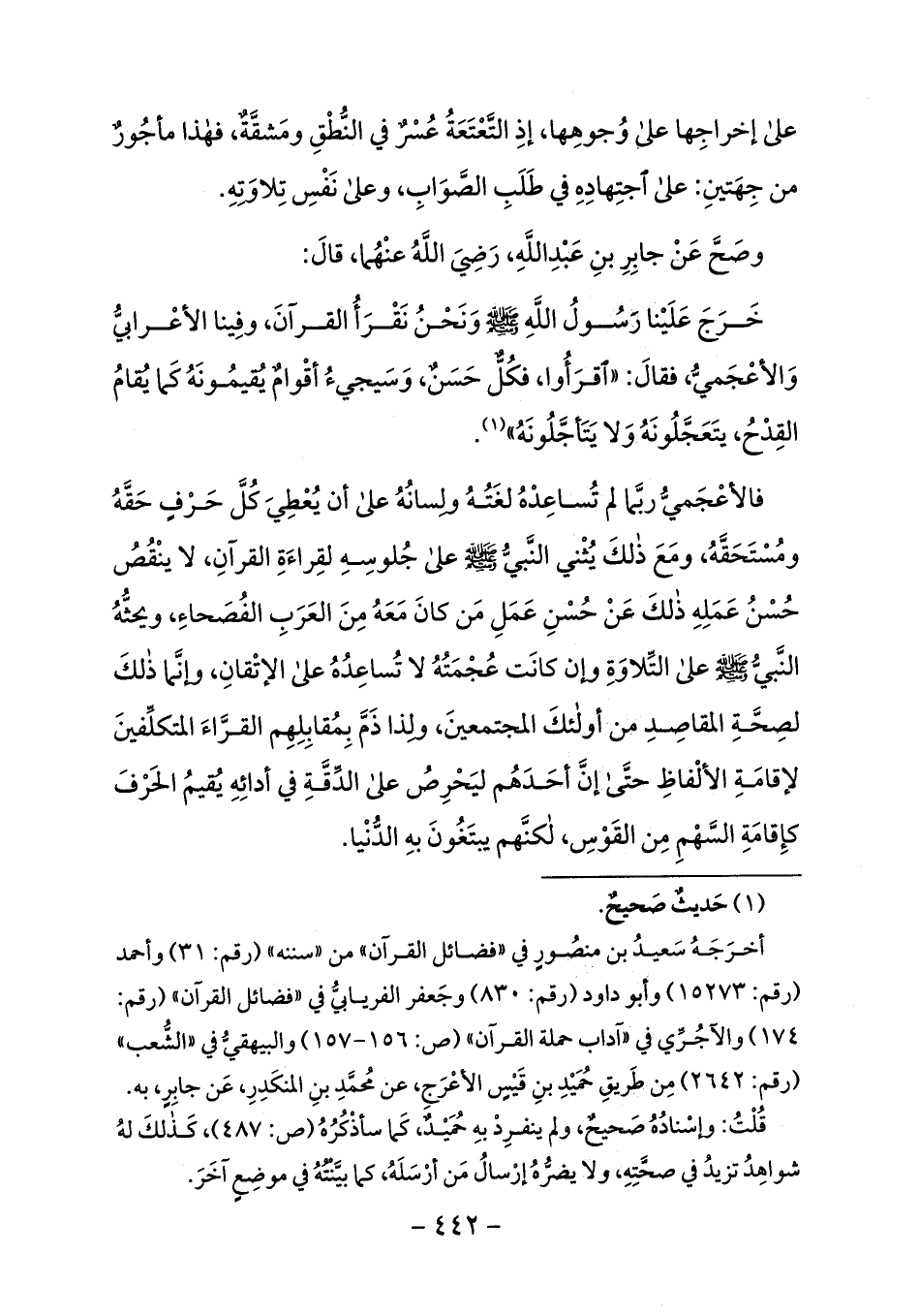 فالأعجميّ ربّما لم تساعده لغته ولسانه على أن يعطي كلّ حرف حقّه ومستحقّه، ومع ذلك يثني النّبيّ صلى الله عليه وسلم على جلوسه لقراءة القرآن، لا ينقص حسن عمله ذلك عن حسن عمل من كان معه من العرب
