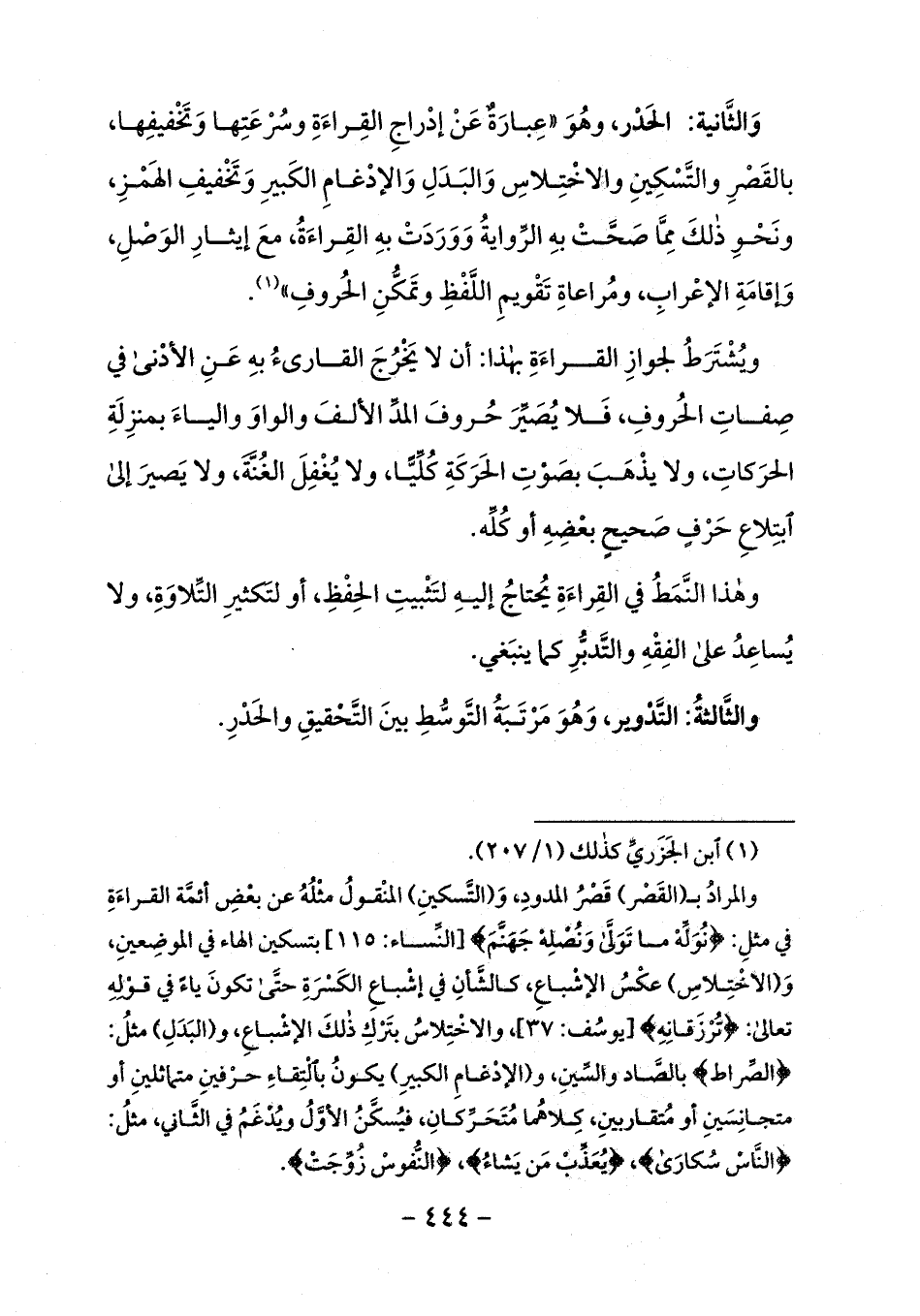 والثّانية: الحذر، وهو «عبارة عن إدراج القراءة وسرعتها وتخفيفها، بالقصر والتّسكين والاختلاس والبدل والإدغام الكبير وتخفيف الهمز، ونحو ذلك ممّا صحّت به الرّواية ووردت به القراءة، مع إيثار الوصل، وإقامة الإعراب، ومراعاة تقويم اللّفظ وتمكّن الحروف» (¬1).