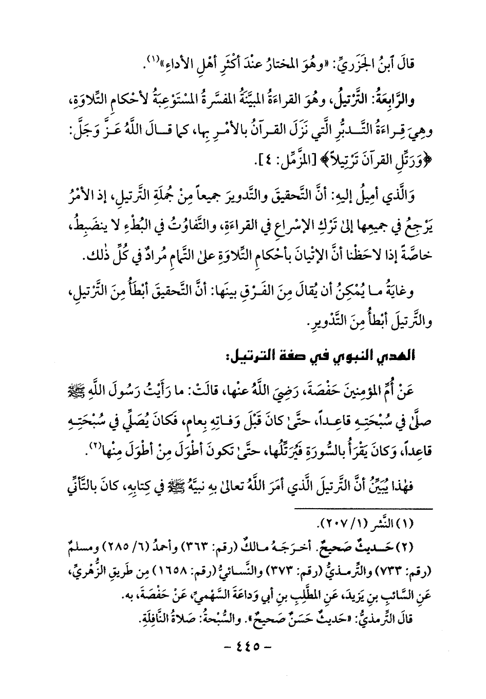 والرّابعة: التّرتيل، وهو القراءة المبيّنة المفسّرة المستوعبة لأحكام التّلاوة، وهي قراءة التّدبّر الّتي نزل القرآن بالأمر بها، كما قال الله عزّ وجلّ: وَرَتِّلِ الْقُرْآنَ تَرْتِيلًا [المزّمّل: 4].