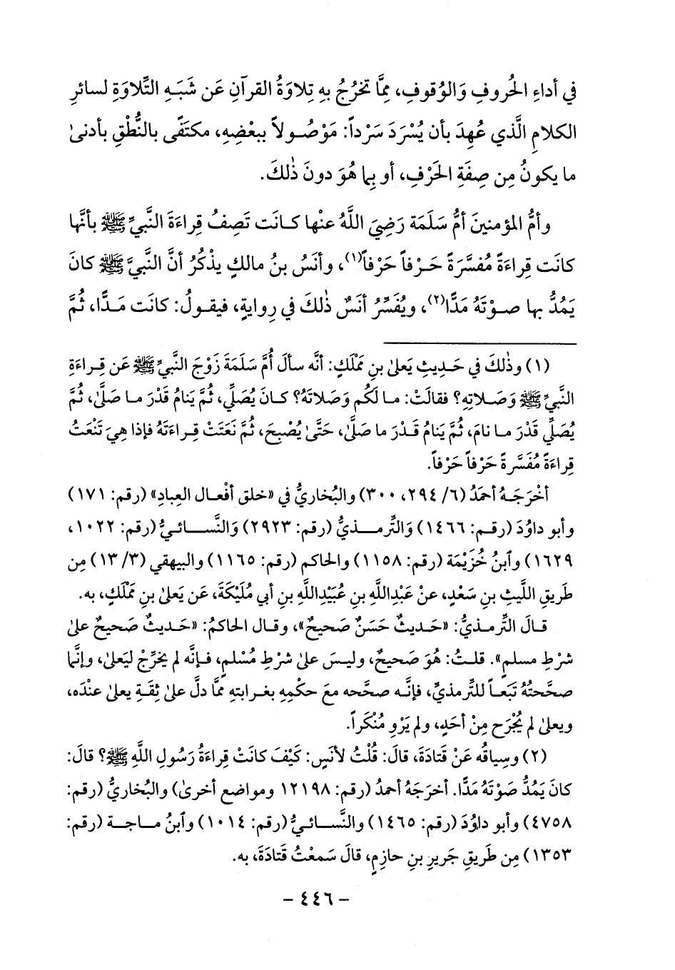 (¬1) وذلك في حديث يعلى بن مملك: أنّه سأل أمّ سلمة زوج النّبيّ صلى الله عليه وسلم عن قراءة النّبيّ صلى الله عليه وسلم وصلاته؟ فقالت: ما لكم وصلاته؟ كان يصلّي، ثمّ ينام قدر ما صلّى، ثمّ يصلّي قدر ما نام، ثمّ ينام قدر ما صلّى، حتّى يصبح، ثمّ نعتت قراءته فإذا هي تنعت قراءة مفسّرة حرفا حرفا.