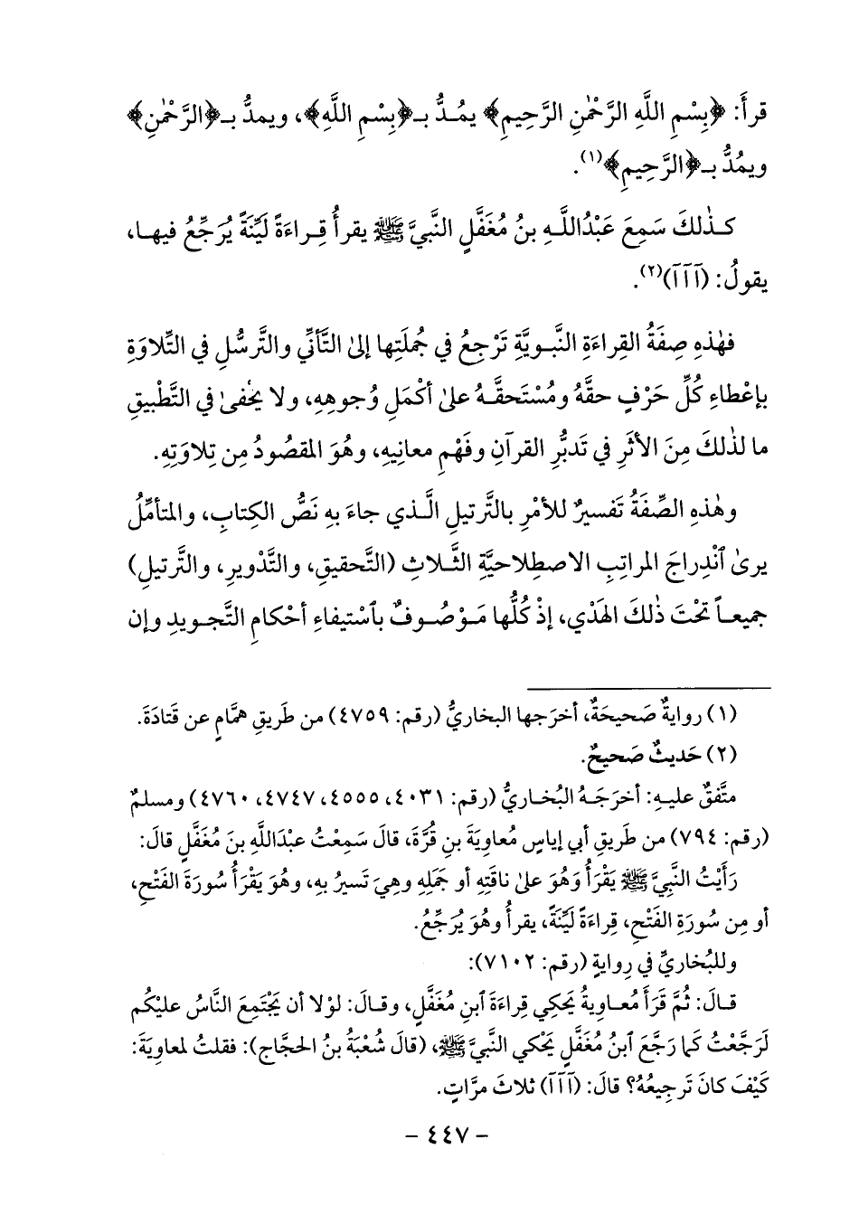 قال: ثمّ قرأ معاوية يحكي قراءة ابن مغفّل، وقال: لولا أن يجتمع النّاس عليكم لرجّعت كما رجّع ابن مغفّل يحكي النّبيّ صلى الله عليه وسلم، (قال شعبة بن الحجّاج): فقلت لمعاوية: كيف كان ترجيعه؟ قال: (آآآ) ثلاث مرّات.