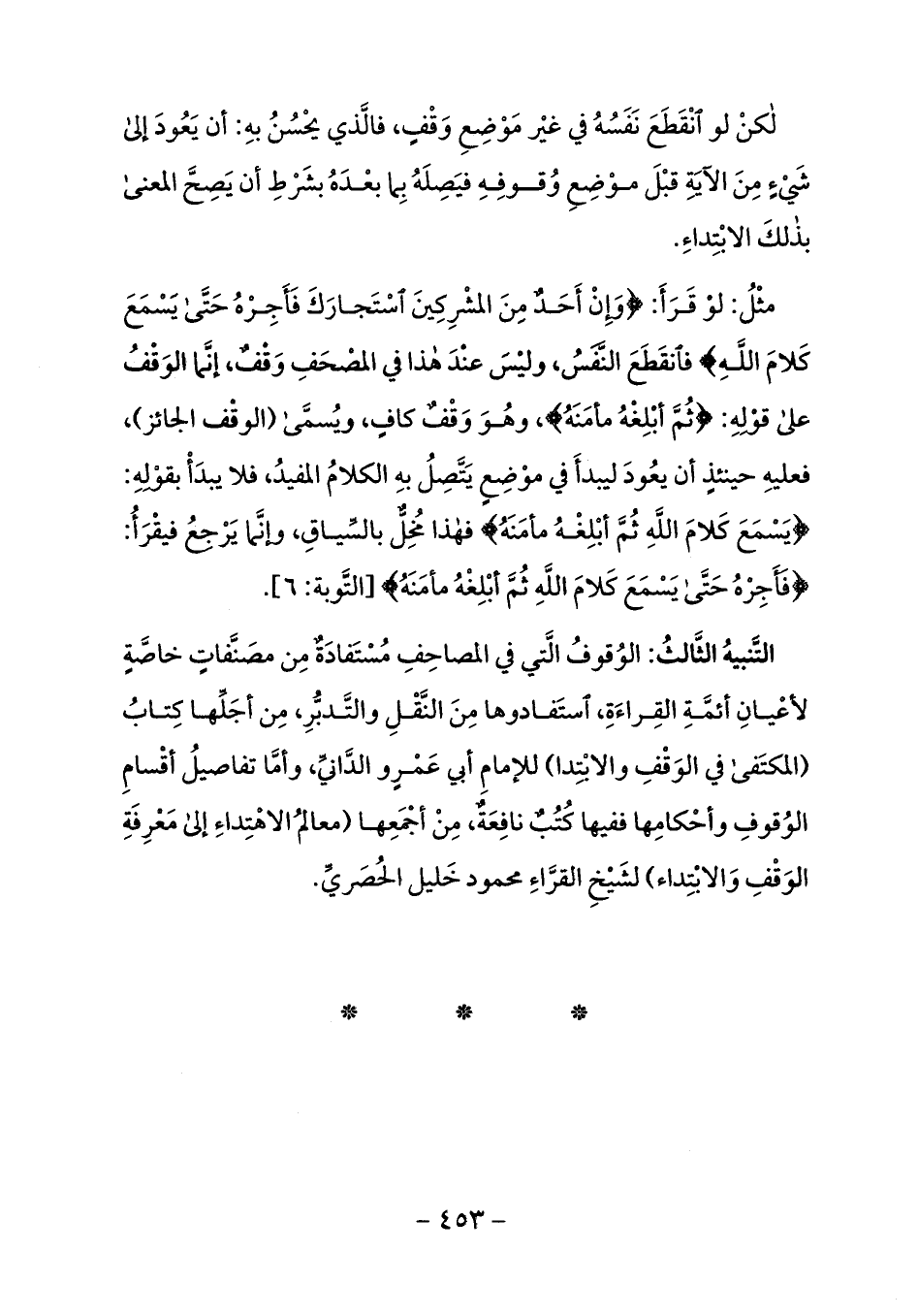 التّنبيه الثّالث: الوقوف الّتي في المصاحف مستفادة من مصنّفات خاصّة لأعيان أئمّة القراءة، استفادوها من النّقل والتّدبّر، من أجلّها كتاب (المكتفى في الوقف والابتداء) للإمام أبي عمرو الدّانيّ، وأمّا تفاصيل أقسام الوقوف وأحكامها ففيها كتب نافعة، من أجمعها (معالم الاهتداء إلى معرفة الوقف والابتداء) لشيخ القرّاء محمود خليل الحصريّ.