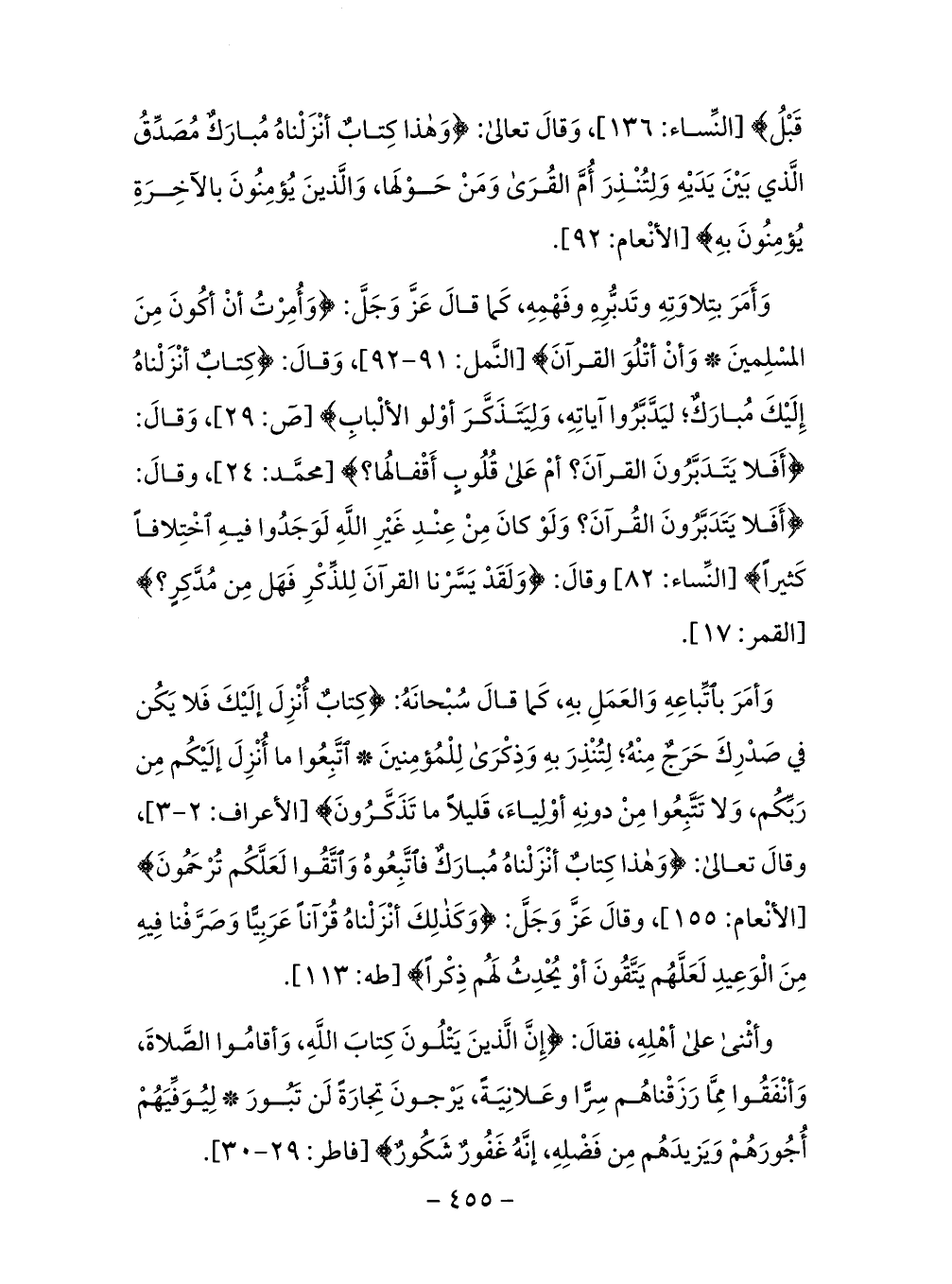 وأمر بتلاوته وتدبّره وفهمه، كما قال عزّ وجلّ: وَأُمِرْتُ أَنْ أَكُونَ مِنَ الْمُسْلِمِينَ وَأَنْ أَتْلُوَا الْقُرْآنَ [النّمل: 91 - 92]، وقال: كِتابٌ أَنْزَلْناهُ إِلَيْكَ مُبارَكٌ لِيَدَّبَّرُوا آياتِهِ وَلِيَتَذَكَّرَ