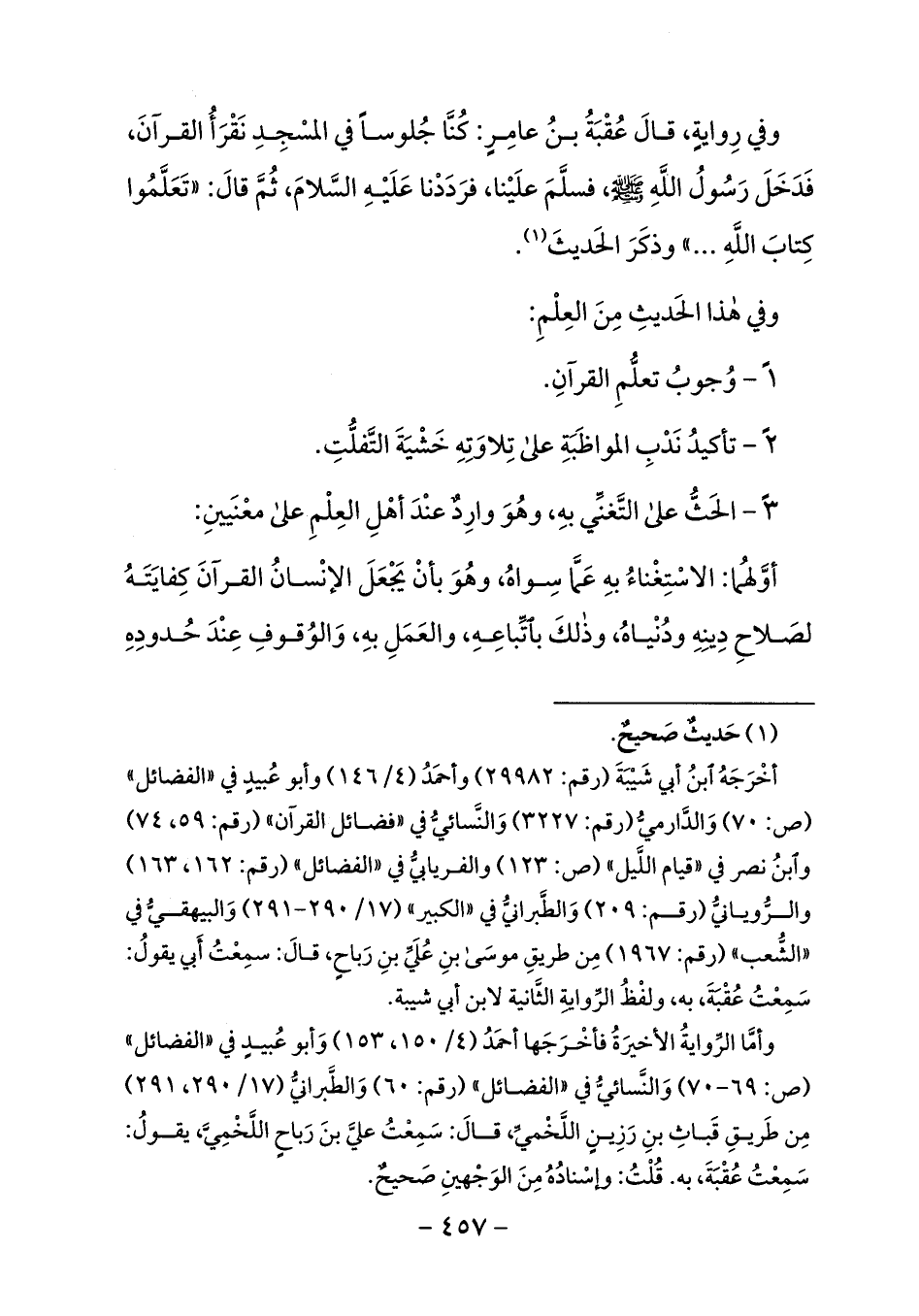 وفي رواية، قال عقبة بن عامر: كنّا جلوسا في المسجد نقرأ القرآن، فدخل رسول الله صلى الله عليه وسلم، فسلّم علينا، فرددنا عليه السّلام، ثمّ قال: «تعلّموا كتاب الله ... » وذكر الحديث (¬1).