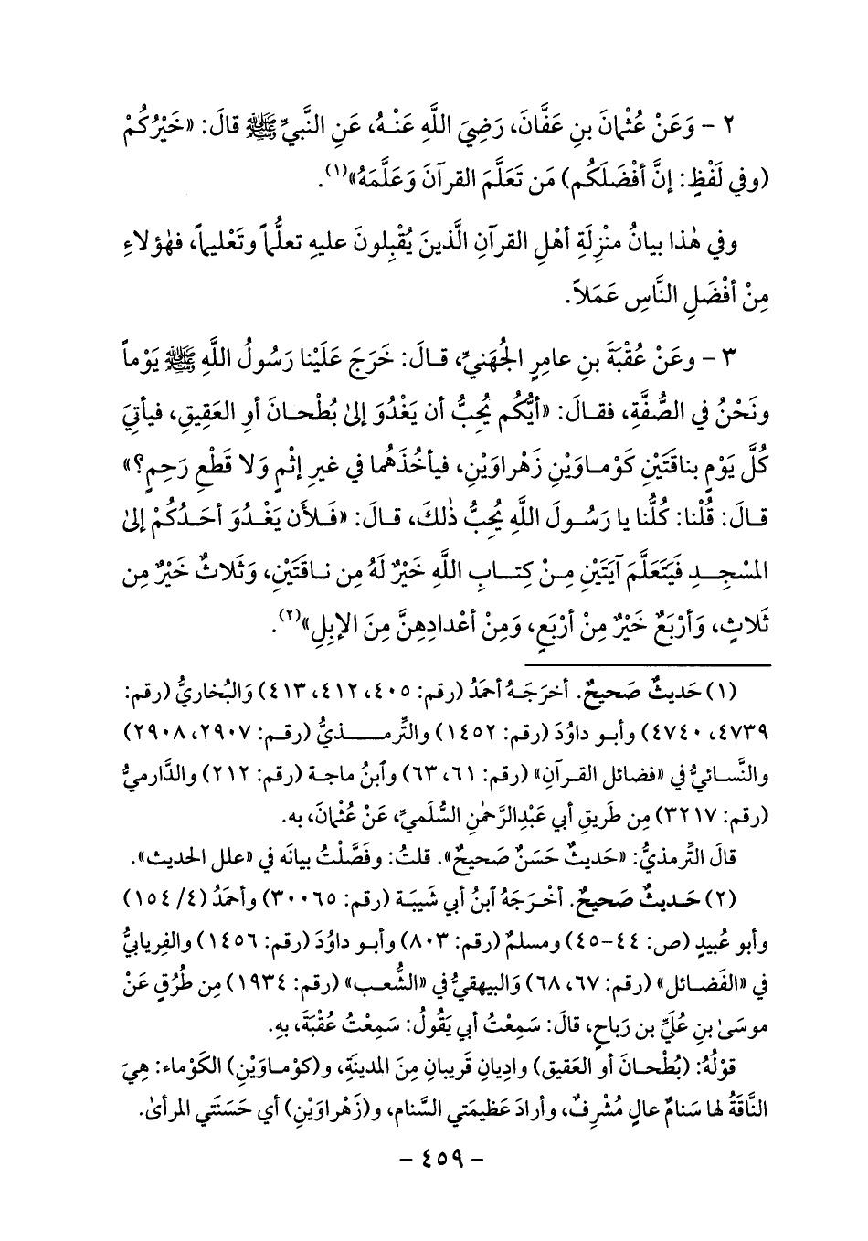 3 - وعن عقبة بن عامر الجهنيّ، قال: خرج علينا رسول الله صلى الله عليه وسلم يوما ونحن في الصّفّة، فقال: «أيّكم يحبّ أن يغدو إلى بطحان أو العقيق، فيأتي كلّ يوم بناقتين كوماوين زهراوين، فيأخذهما في غير إثم ولا قطع رحم؟» قال: قلنا: كلّنا يا رسول الله يحبّ ذلك، قال:
