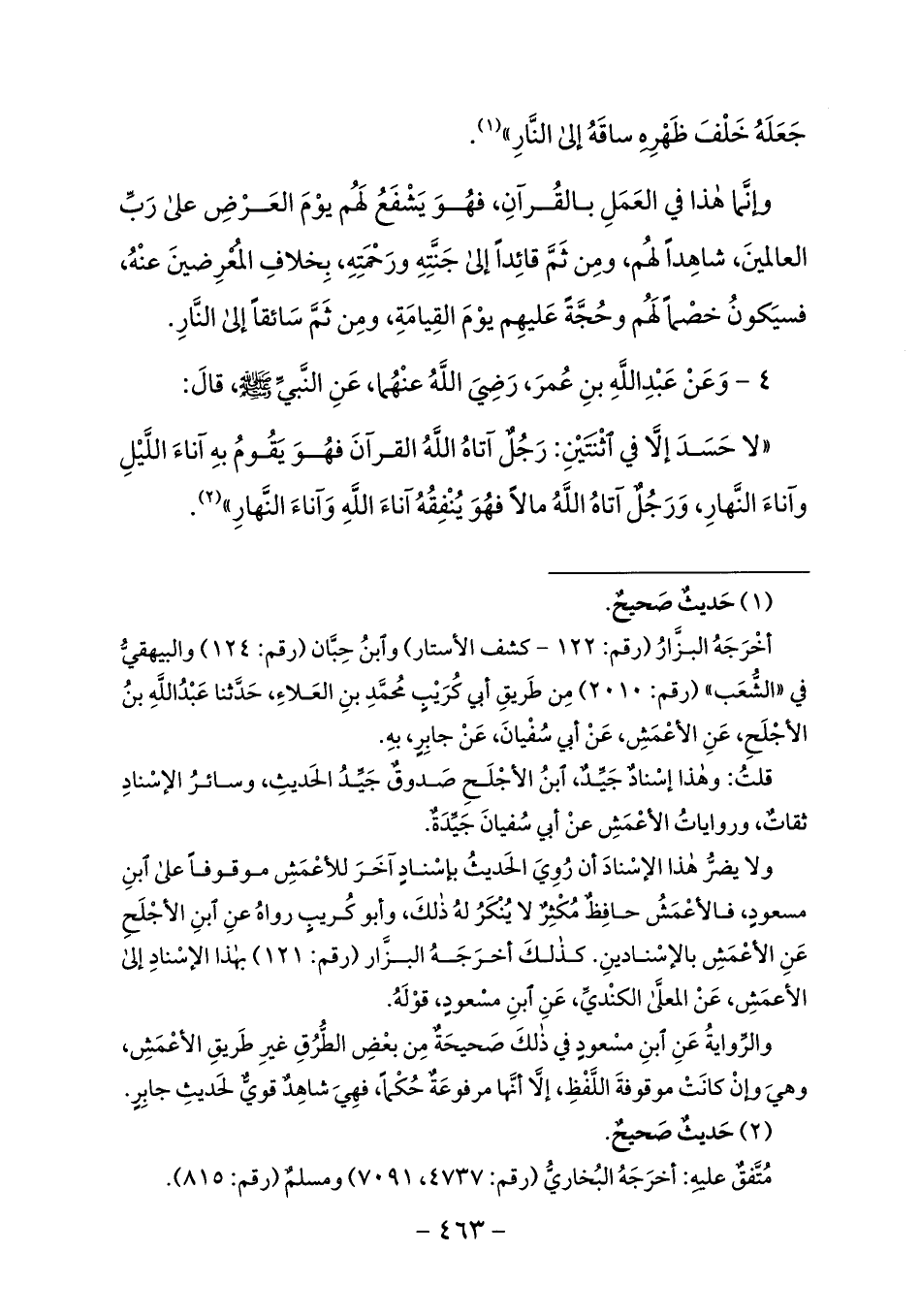 (¬1) حديث صحيح. أخرجه البزّار (رقم: 122 - كشف الأستار) وابن حبّان (رقم: 124) والبيهقيّ في «الشّعب» (رقم: 2010) من طريق أبي كريب محمّد بن العلاء، حدّثنا عبد الله بن الأجلح، عن الأعمش، عن أبي سفيان، عن جابر، به. قلت: وهذا إسناد جيّد، ابن الأجلح صدوق جيّد الحديث، وسائر الإسناد ثقات، وروايات الأعمش عن أبي سفيان جيّدة.