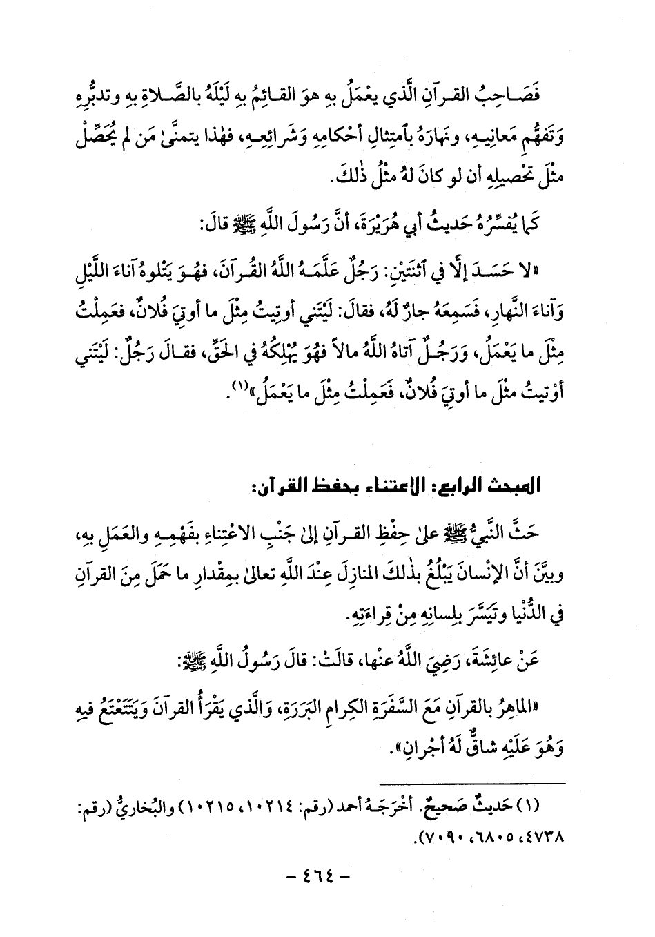 «لا حسد إلّا في اثنتين: رجل علّمه الله القرآن، فهو يتلوه آناء اللّيل وآناء النّهار، فسمعه جار له، فقال: ليتني أوتيت مثل ما أوتي فلان، فعملت مثل ما يعمل، ورجل آتاه الله مالا فهو يهلكه في الحقّ، فقال رجل: ليتني أوتيت مثل ما أوتي فلان، فعملت مثل ما يعمل» (¬1).