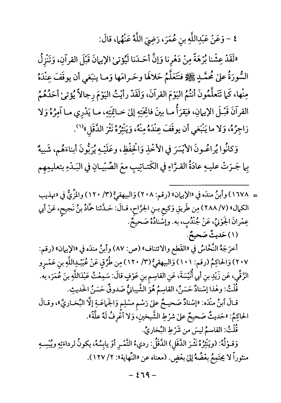 «لقد عشنا برهة من دهرنا وإنّ أحدنا ليؤتى الإيمان قبل القرآن، وتنزل السّورة على محمّد صلى الله عليه وسلم فنتعلّم حلالها وحرامها وما ينبغي أن يوقف عنده منها، كما تتعلّمون أنتم اليوم القرآن، ولقد رأيت اليوم رجالا يؤتى أحدهم القرآن قبل الإيمان، فيقرأ ما بين فاتحته إلى خاتمته، ما يدري ما آمره ولا زاجره، ولا ما ينبغي أن يوقف عنده منه، وينثره نثر الدّقل» (¬1).