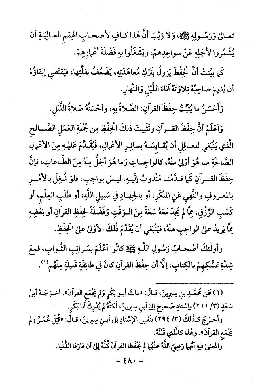 واعلم أنّ حفظ القرآن وتثبيت ذلك الحفظ من جملة العمل الصّالح الّذي ينبغي للعاقل أن يقايسه بسائر الأعمال، فيقدّم عليه من الأعمال الصّالحة ما هو أولى منه، كالواجبات وما هو أجلّ منه من الطّاعات، فإنّ حفظ القرآن كما قدّمنا مندوب إليه، ليس بواجب، فلو