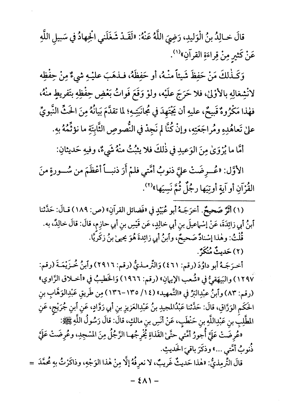 الأوّل: «عرضت عليّ ذنوب أمّتي فلم أر ذنبا أعظم من سورة من القرآن أو آية أوتيها رجل ثمّ نسيها» (¬2).