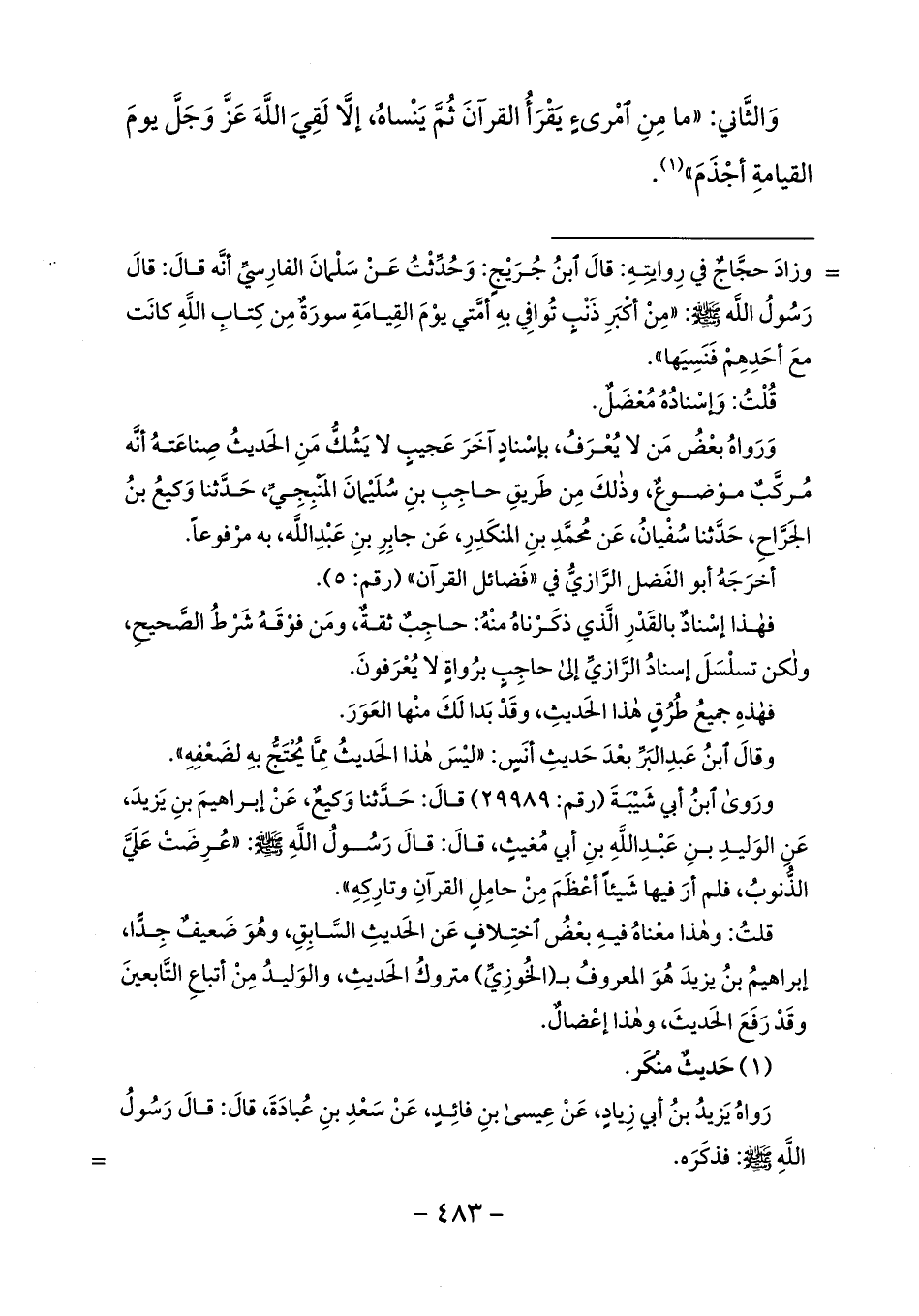 قلت: وهذا معناه فيه بعض اختلاف عن الحديث السّابق، وهو ضعيف جدّا، إبراهيم بن يزيد هو المعروف ب (الخوزيّ) متروك الحديث، والوليد من أتباع التّابعين وقد رفع الحديث، وهذا إعضال.