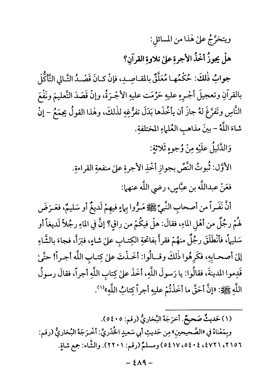 على كتاب الله أجرا! حتّى قدموا المدينة، فقالوا: يا رسول الله، أخذ على كتاب الله أجرا، فقال رسول الله صلى الله عليه وسلم: «إنّ أحقّ ما أخذتم عليه أجرا كتاب الله» (¬1).