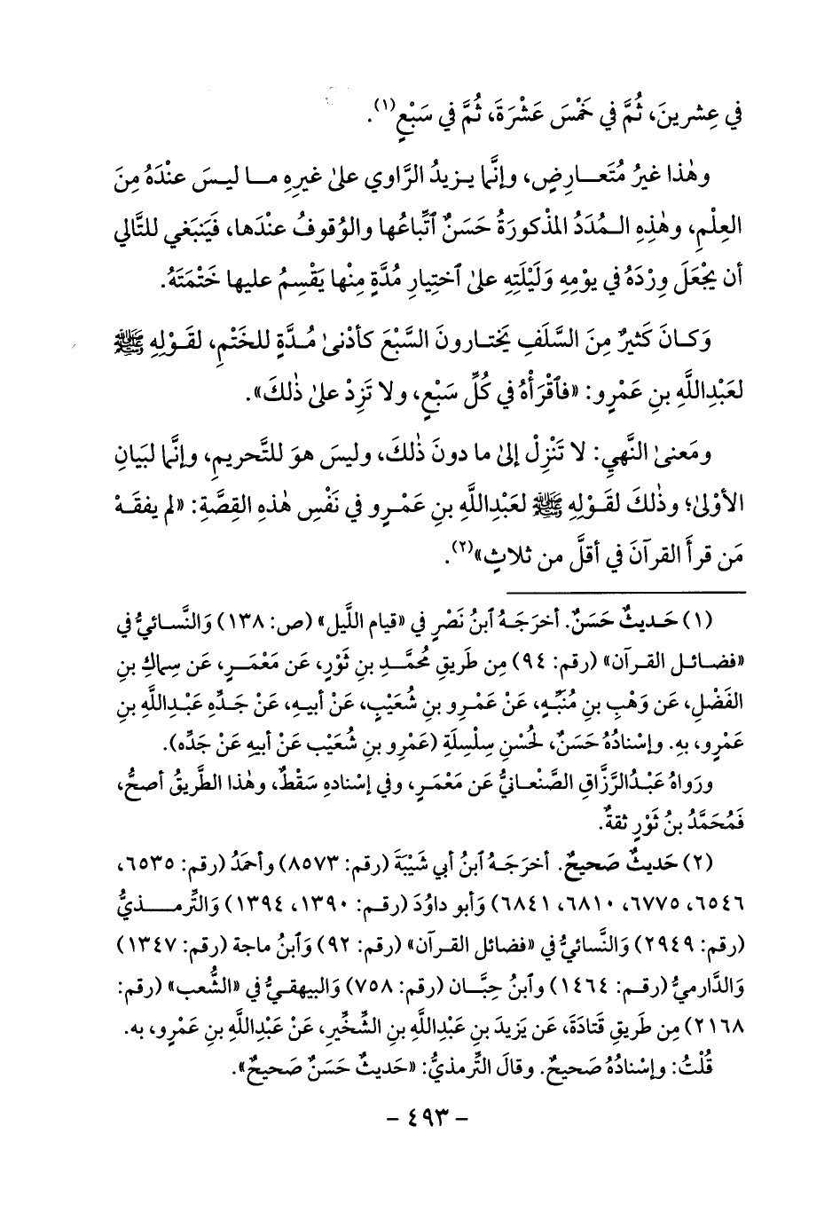 (¬1) حديث حسن. أخرجه ابن نصر في «قيام اللّيل» (ص: 138) والنّسائيّ في «فضائل القرآن» (رقم: 94) من طريق محمّد بن ثور، عن معمر، عن سماك بن الفضل، عن وهب بن منبّه، عن عمرو بن شعيب، عن أبيه، عن جدّه عبد الله بن عمرو، به. وإسناده حسن، لحسن سلسلة (عمرو بن شعيب عن أبيه عن جدّه).