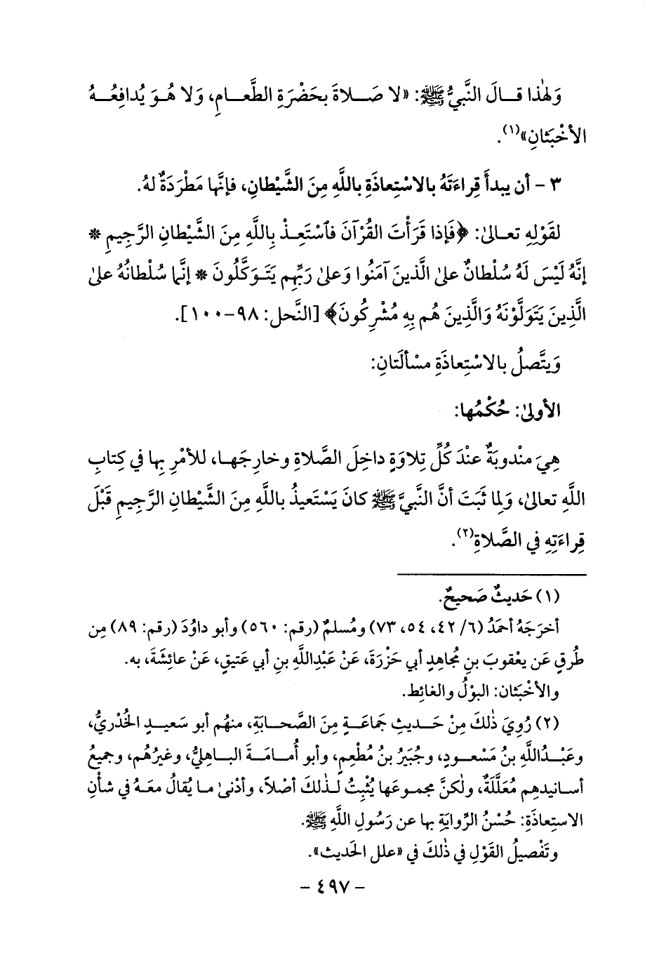 (¬2) روي ذلك من حديث جماعة من الصّحابة، منهم أبو سعيد الخدريّ، وعبد الله بن مسعود، وجبير بن مطعم، وأبو أمامة الباهليّ، وغيرهم، وجميع أسانيدهم معلّلة، ولكنّ مجموعها يثبت لذلك أصلا، وأدنى ما يقال معه في شأن الاستعاذة: حسن الرّواية بها عن رسول الله صلى الله عليه وسلم.