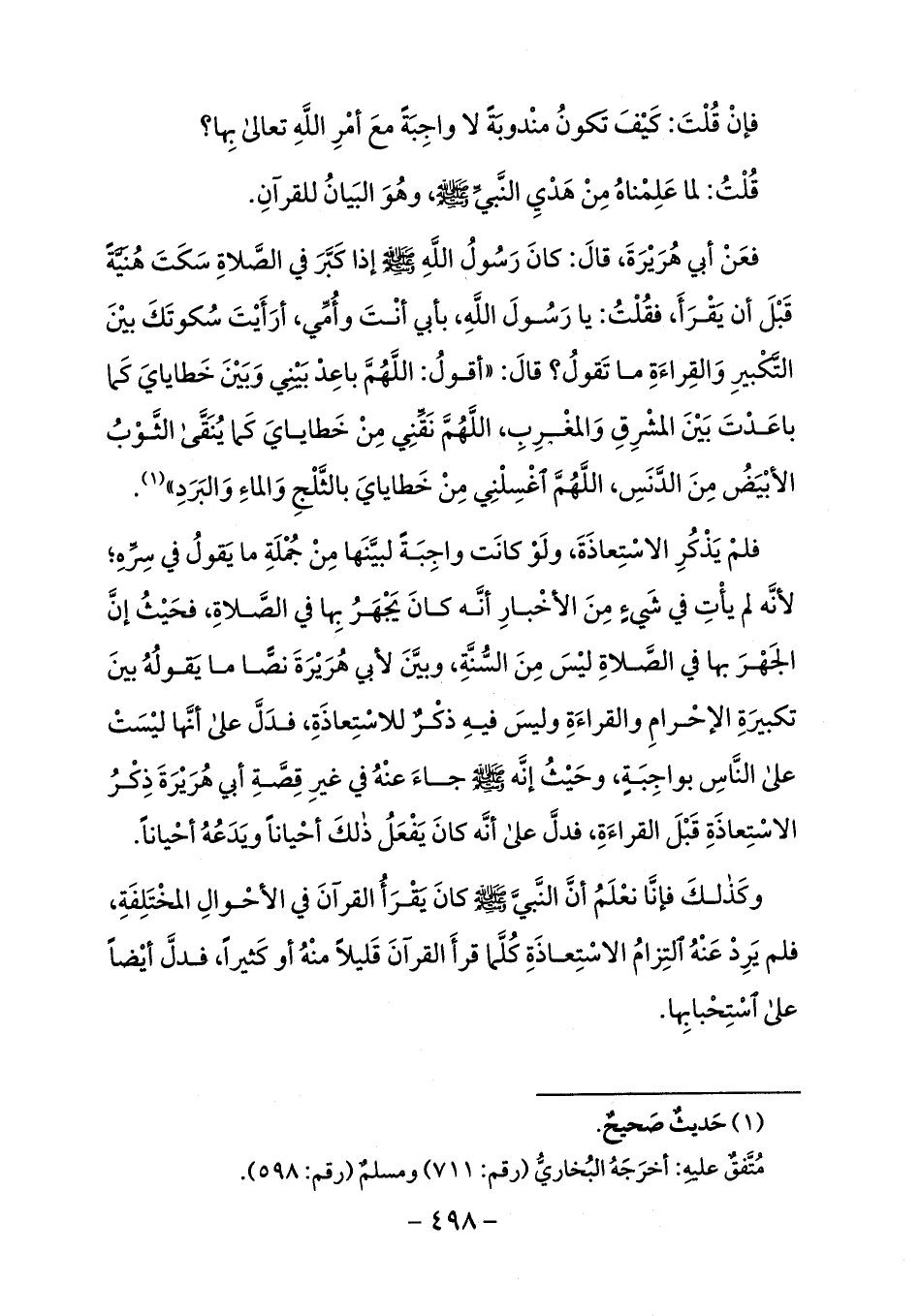 فلم يذكر الاستعاذة، ولو كانت واجبة لبيّنها من جملة ما يقول في سرّه؛ لأنّه لم يأت في شيء من الأخبار أنّه كان يجهر بها في الصّلاة، فحيث إنّ الجهر بها في الصّلاة ليس من السّنّة، وبيّن لأبي هريرة نصّا ما يقوله بين تكبيرة الإحرام والقراءة وليس فيه ذكر للاستعاذة، فدلّ على أنّها ليست على النّاس بواجبة، وحيث إنّه صلى الله عليه وسلم جاء عنه في غير قصّة أبي هريرة ذكر الاستعاذة قبل القراءة، فدلّ على أنّه كان يفعل ذلك أحيانا ويدعه أحيانا.