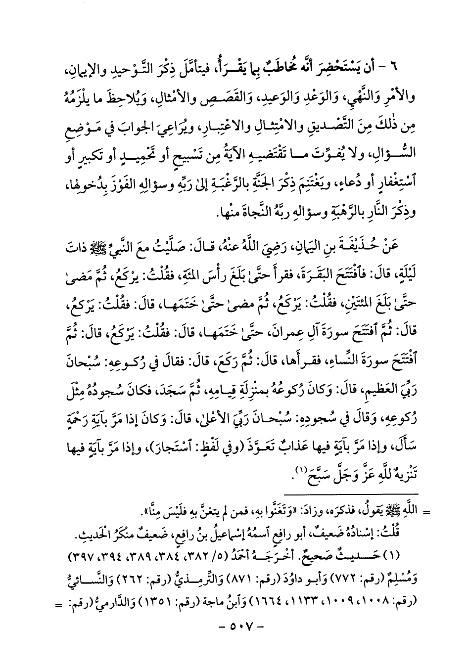 عن حذيفة بن اليمان، رضي الله عنه، قال: صلّيت مع النّبيّ صلى الله عليه وسلم ذات ليلة، قال: فافتتح البقرة، فقرأ حتّى بلغ رأس المائة، فقلت: يركع، ثمّ مضى حتّى بلغ المائتين، فقلت: يركع، ثمّ مضى حتّى ختمها، قال: