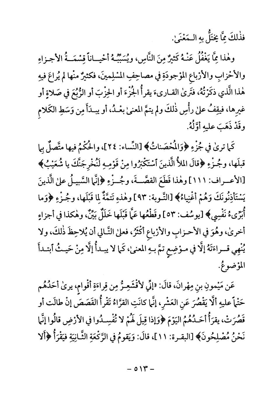 عن ميمون بن مهران، قال: «إنّي لأقشعرّ من قراءة أقوام، يرى أحدهم حتما عليه ألّا يقصر عن العشر، إنّما كانت القرّاء تقرأ القصص إن طالت أو قصرت، يقرأ أحدهم اليوم وَإِذا قِيلَ لَهُمْ لا تُفْسِدُوا فِي الْأَرْضِ قالُوا إِنَّما نَحْنُ مُصْلِحُونَ 11 [البقرة: 11]، قال: ويقوم في الرّكعة الثّانية فيقرأ أَلا
