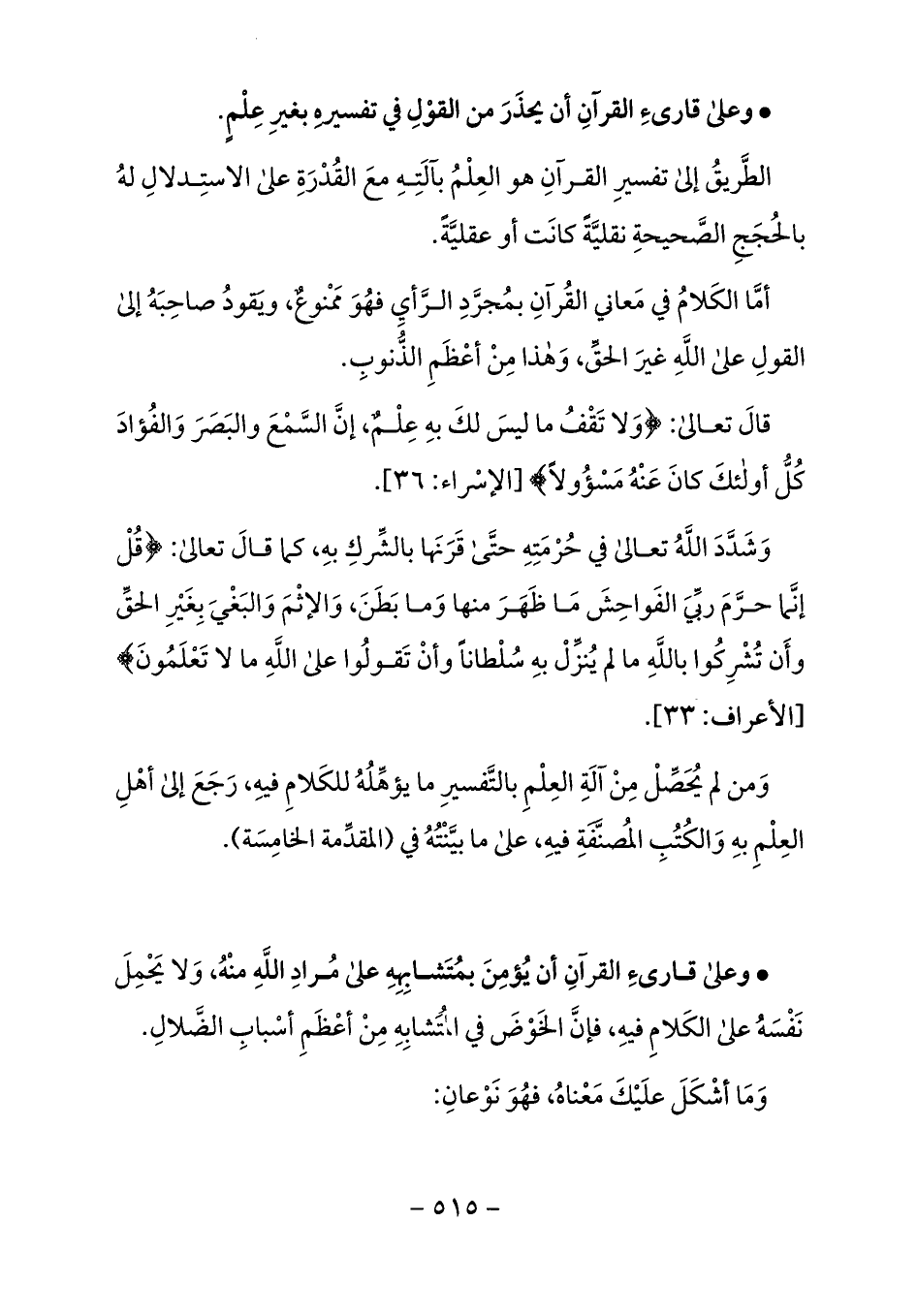 وعلى قارئ القرآن أن يحذر من القول في تفسيره بغير علم.