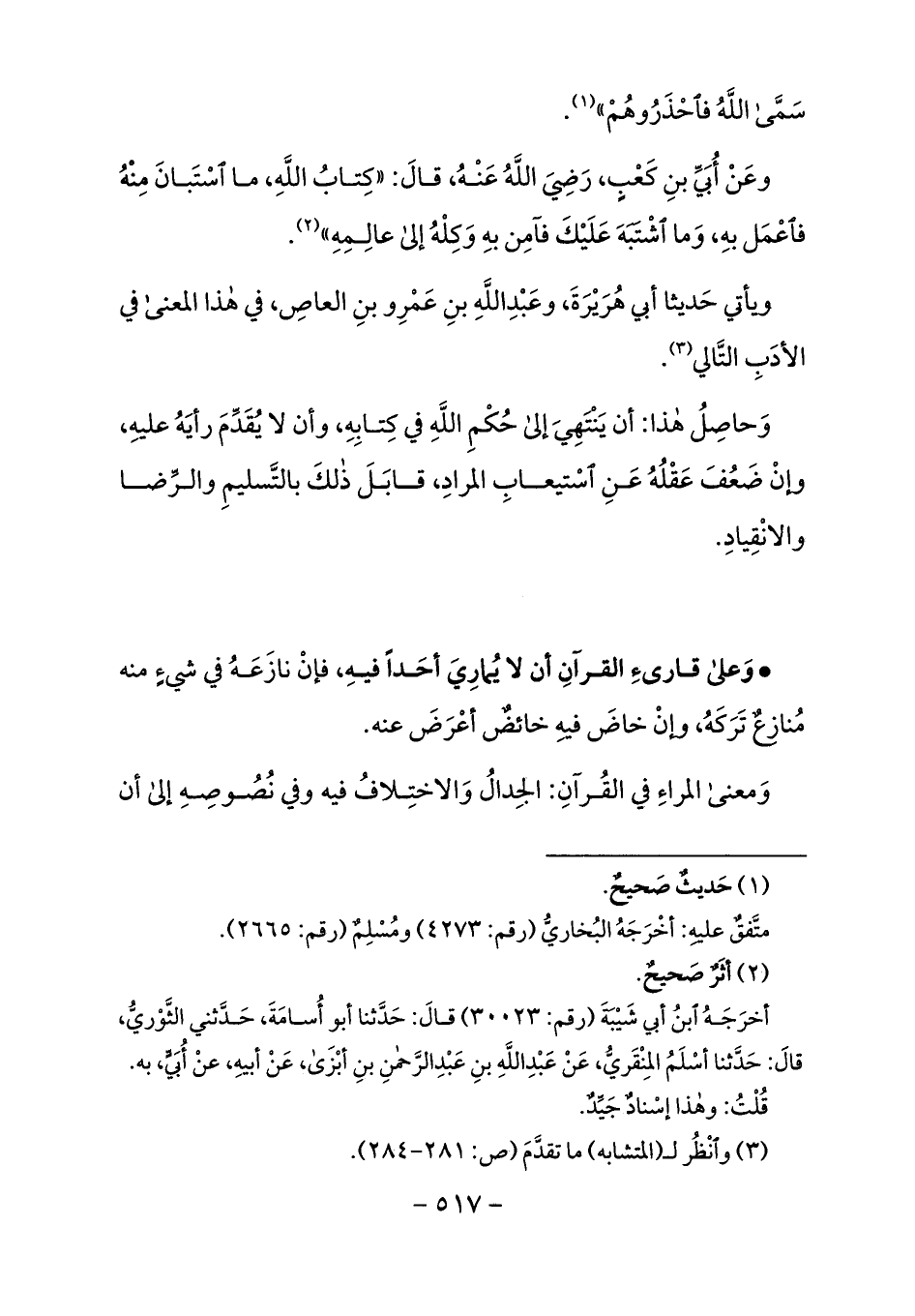 وعن أبيّ بن كعب، رضي الله عنه، قال: «كتاب الله، ما استبان منه فاعمل به، وما اشتبه عليك فآمن به وكله إلى عالمه» (¬2).