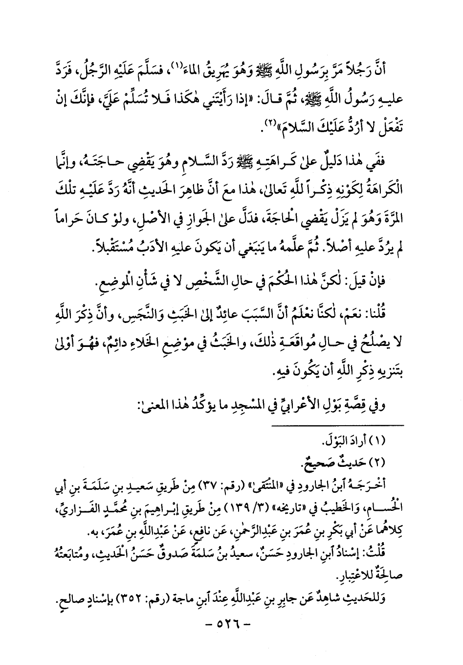 ففي هذا دليل على كراهته صلى الله عليه وسلم ردّ السّلام وهو يقضي حاجته، وإنّما الكراهة لكونه ذكرا لله تعالى، هذا مع أنّ ظاهر الحديث أنّه ردّ عليه تلك المرّة وهو لم يزل يقضي الحاجة، فدلّ على الجواز في الأصل، ولو كان حراما لم يردّ عليه أصلا. ثمّ علّمه ما ينبغي أن يكون عليه الأدب مستقبلا.