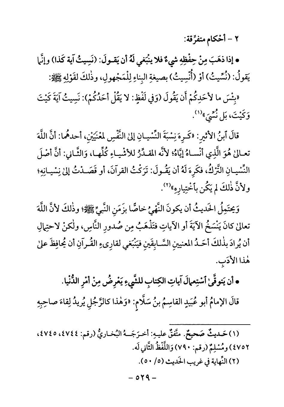 إذا ذهب من حفظه شيء فلا ينبغي له أن يقول: (نسيت آية كذا) وإنّما يقول: (نسّيت) أو (أنسيت) بصيغة البناء للمجهول.