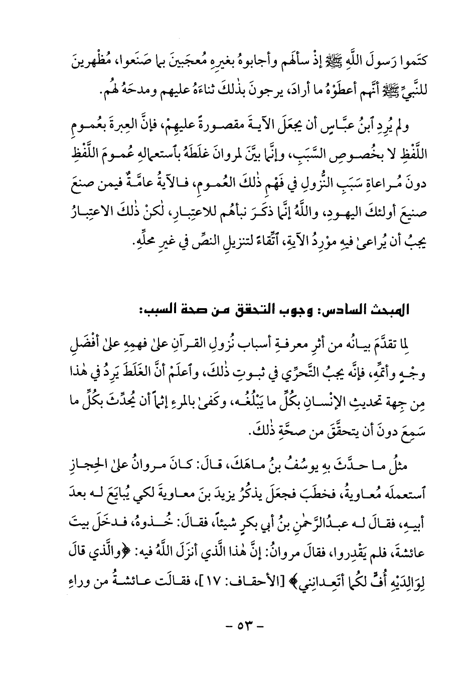 ولم يرد ابن عبّاس أن يجعل الآية مقصورة عليهم، فإنّ العبرة بعموم اللّفظ لا بخصوص السّبب، وإنّما بيّن لمروان غلطه باستعماله عموم اللّفظ دون مراعاة سبب النّزول في فهم ذلك العموم، فالآية عامّة فيمن صنع صنيع أولئك اليهود، والله إنّما ذكر نبأهم للاعتبار، لكن ذلك الاعتبار يجب أن يراعى فيه مورد الآية، اتّقاء لتنزيل النصّ في غير محلّه.