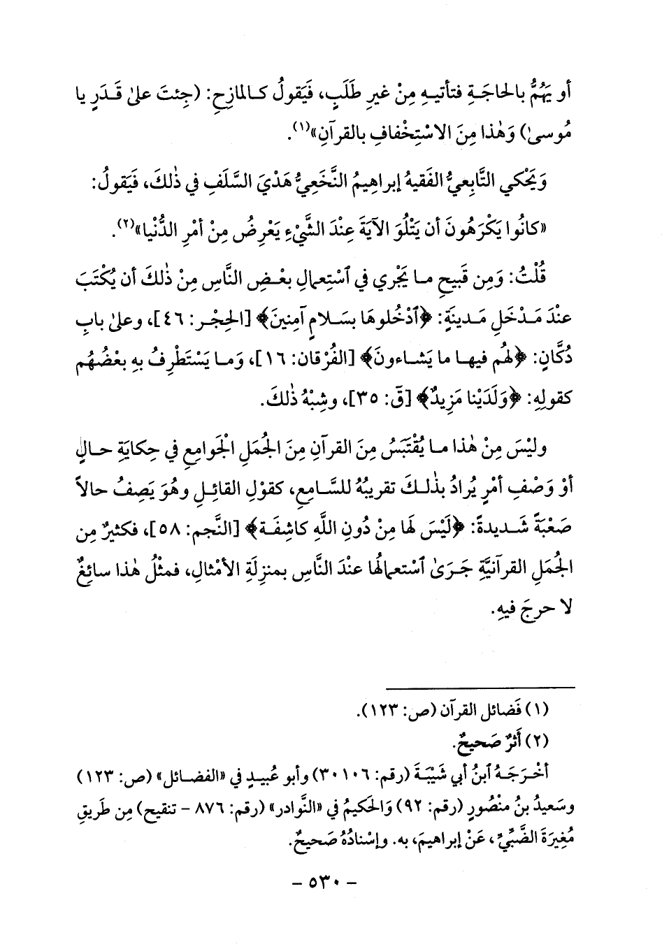 (¬2) أثر صحيح. أخرجه ابن أبي شيبة (رقم: 30106) وأبو عبيد في «الفضائل» (ص: 123) وسعيد بن منصور (رقم: 92) والحكيم في «النّوادر» (رقم: 876 - تنقيح) من طريق مغيرة الضّبّيّ، عن إبراهيم، به. وإسناده صحيح.